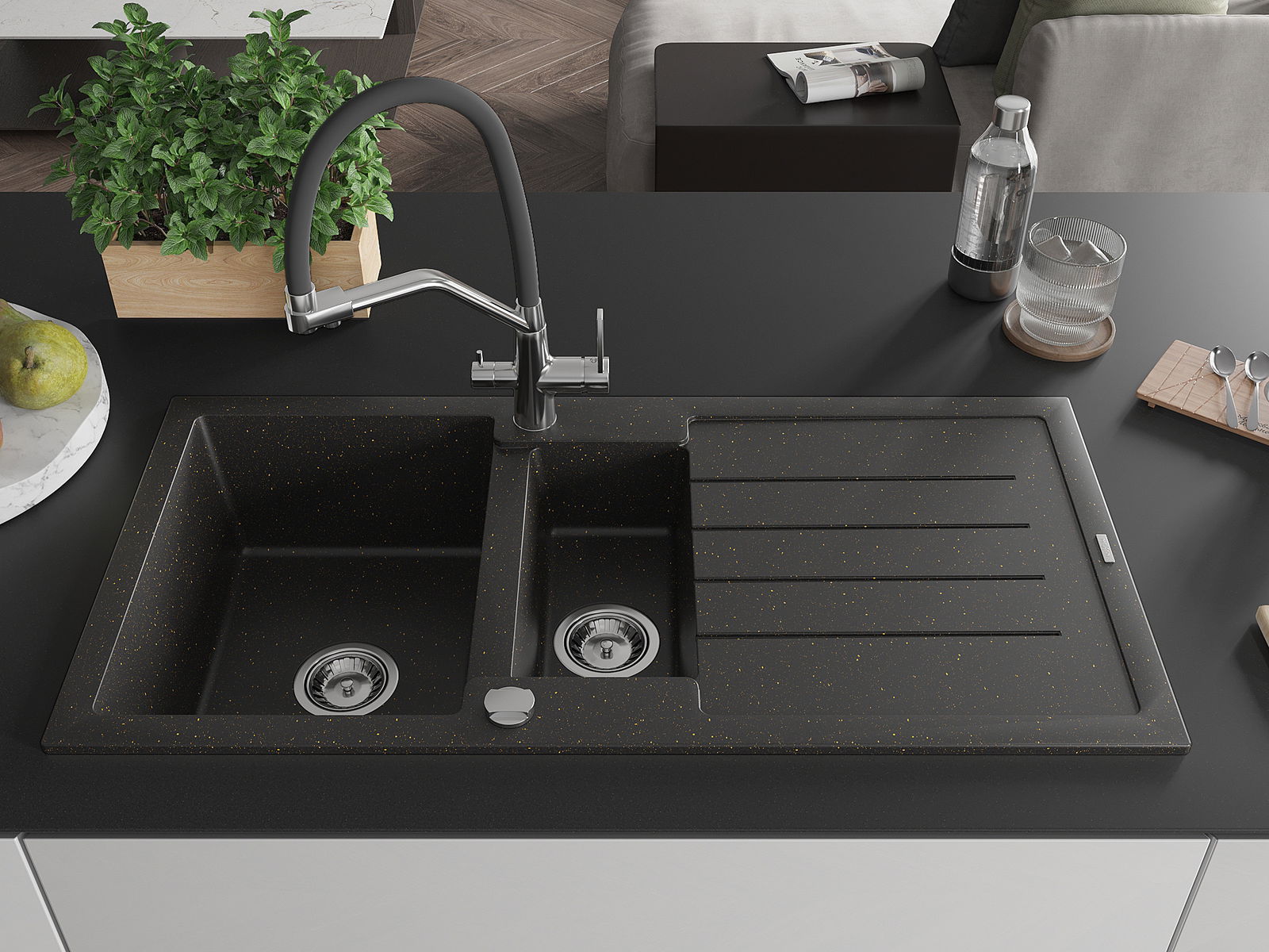 Mexen Andres 1.5-bowl granite sink with drainer and Duo kitchen tap, black/golden metallic - 6515-75-671701-07