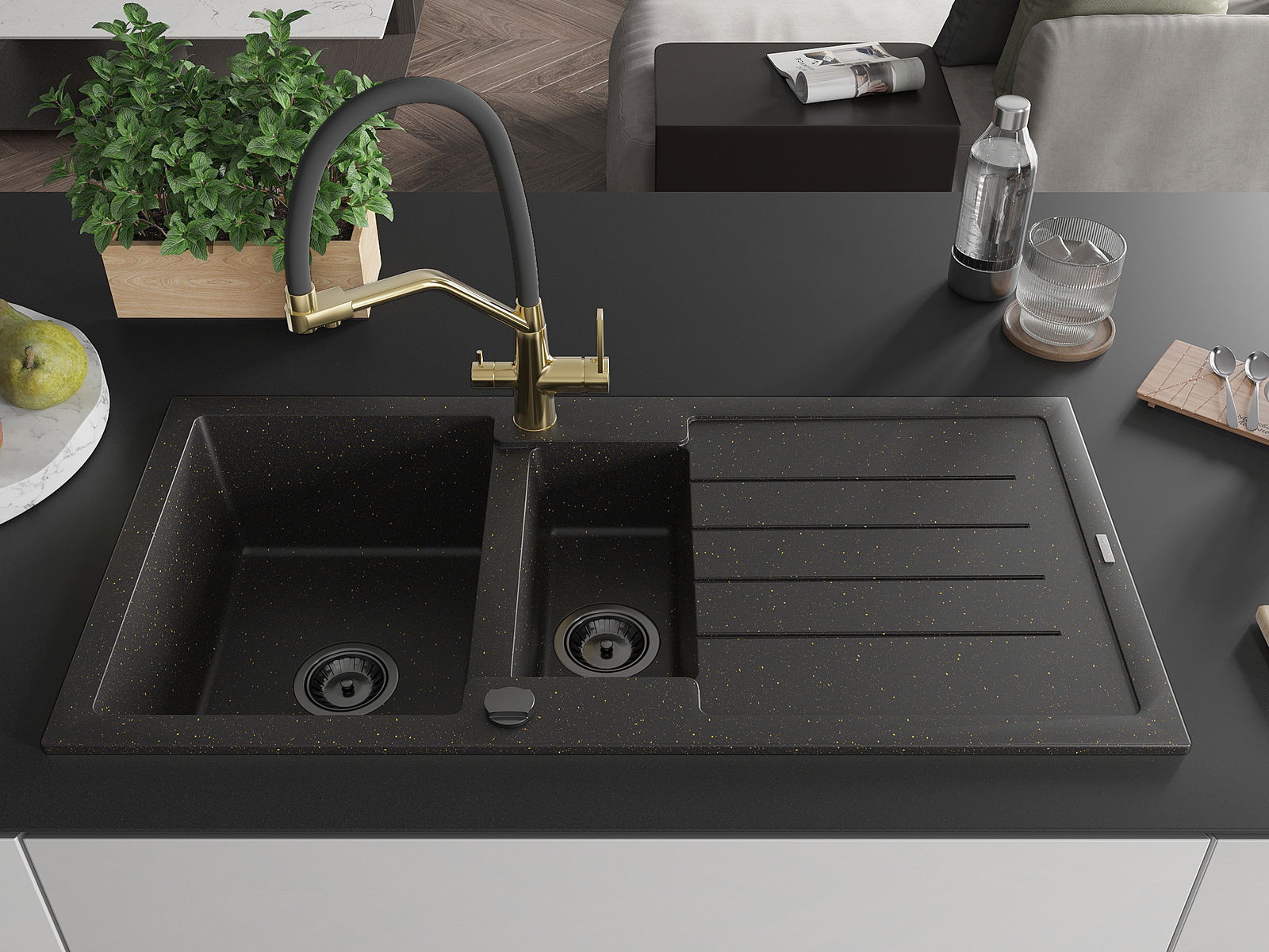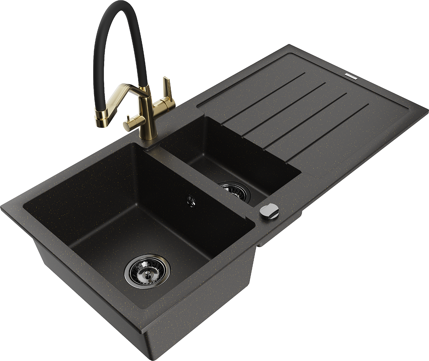Mexen Andres granite sink 1.5-bowl with drainer and Duo kitchen tap, black/golden metallic - 6515-75-671701-57-B