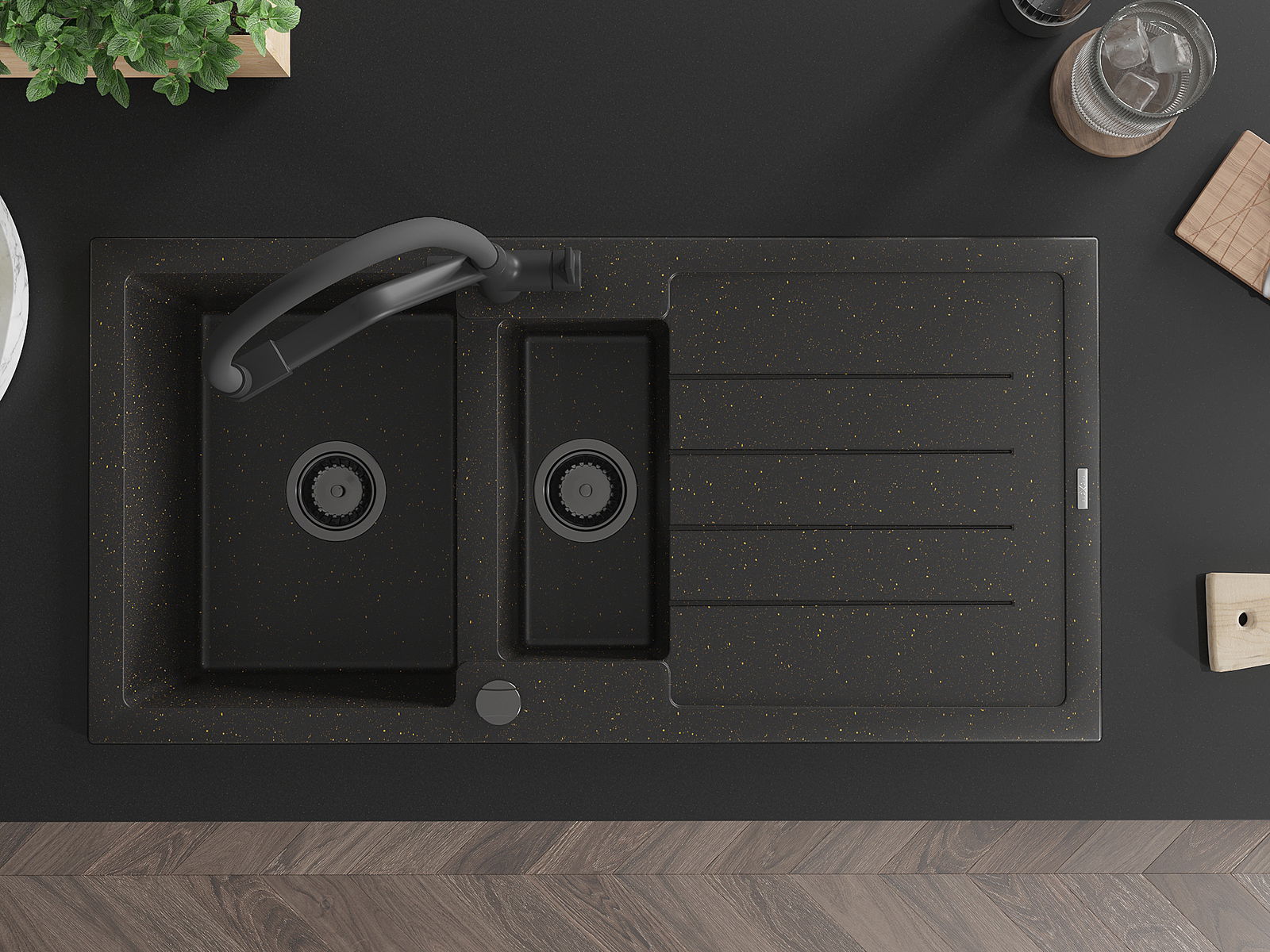 Mexen Andres granite sink 1.5-bowl with drainer and Duo kitchen tap, black/gold metallic - 6515-75-671701-70-B