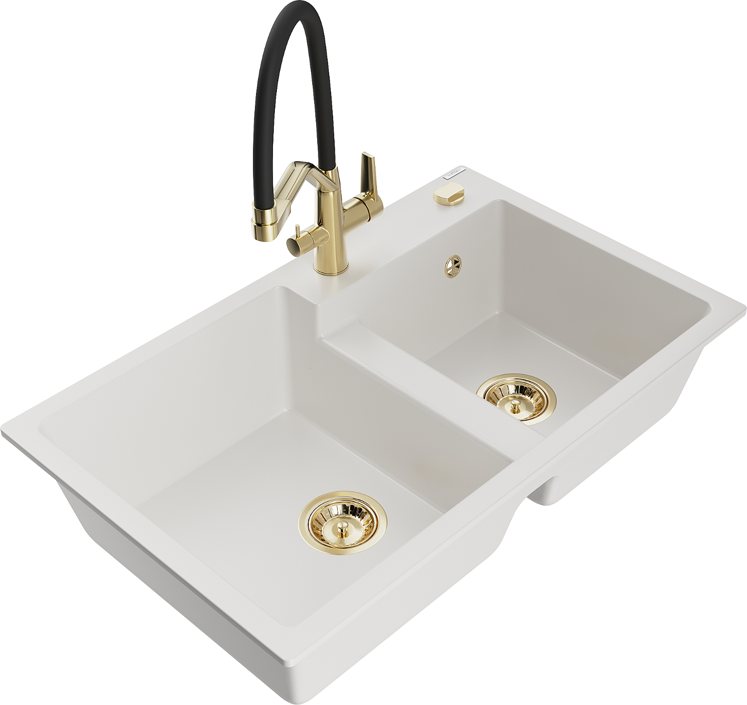 Mexen Tomas 2-bowl granite sink with Duo kitchen tap, white - 6516-20-671701-57-G