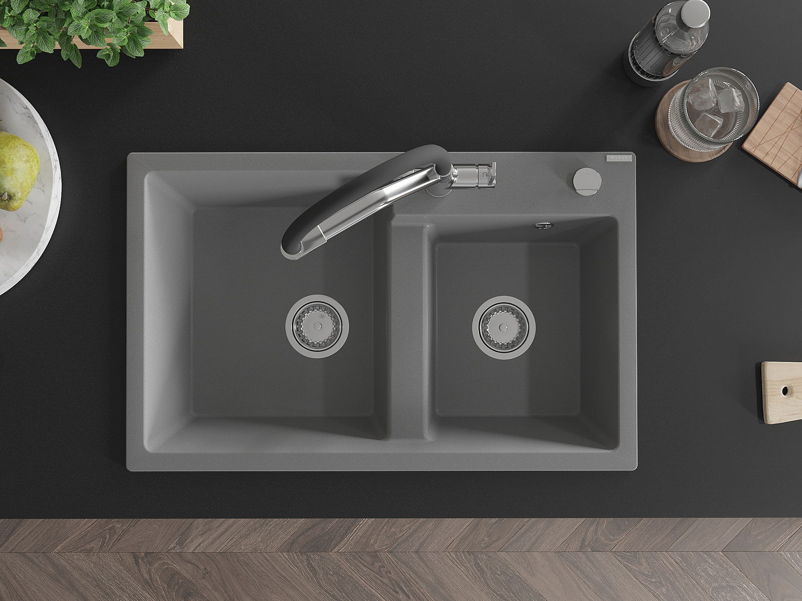 Mexen Tomas granite kitchen sink 2-bowl with Duo kitchen tap, grey - 6516-71-671701-07