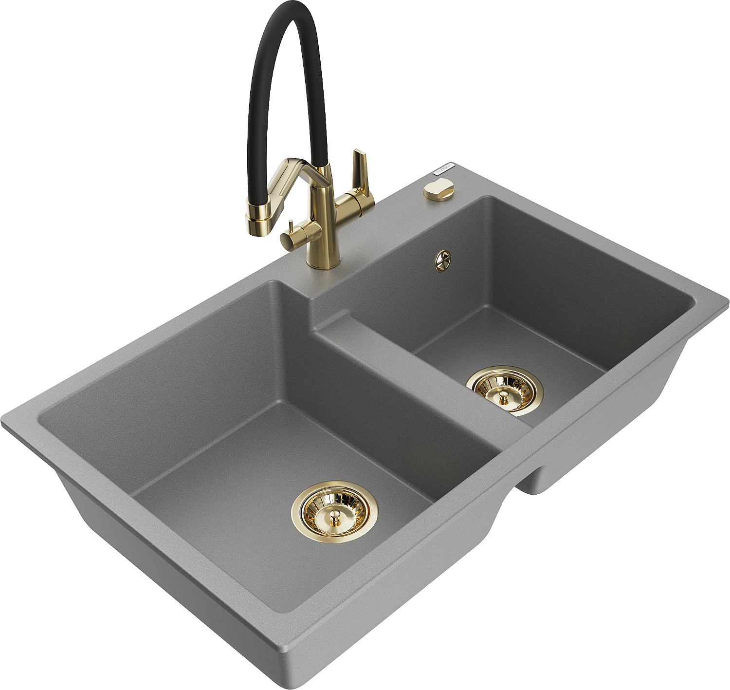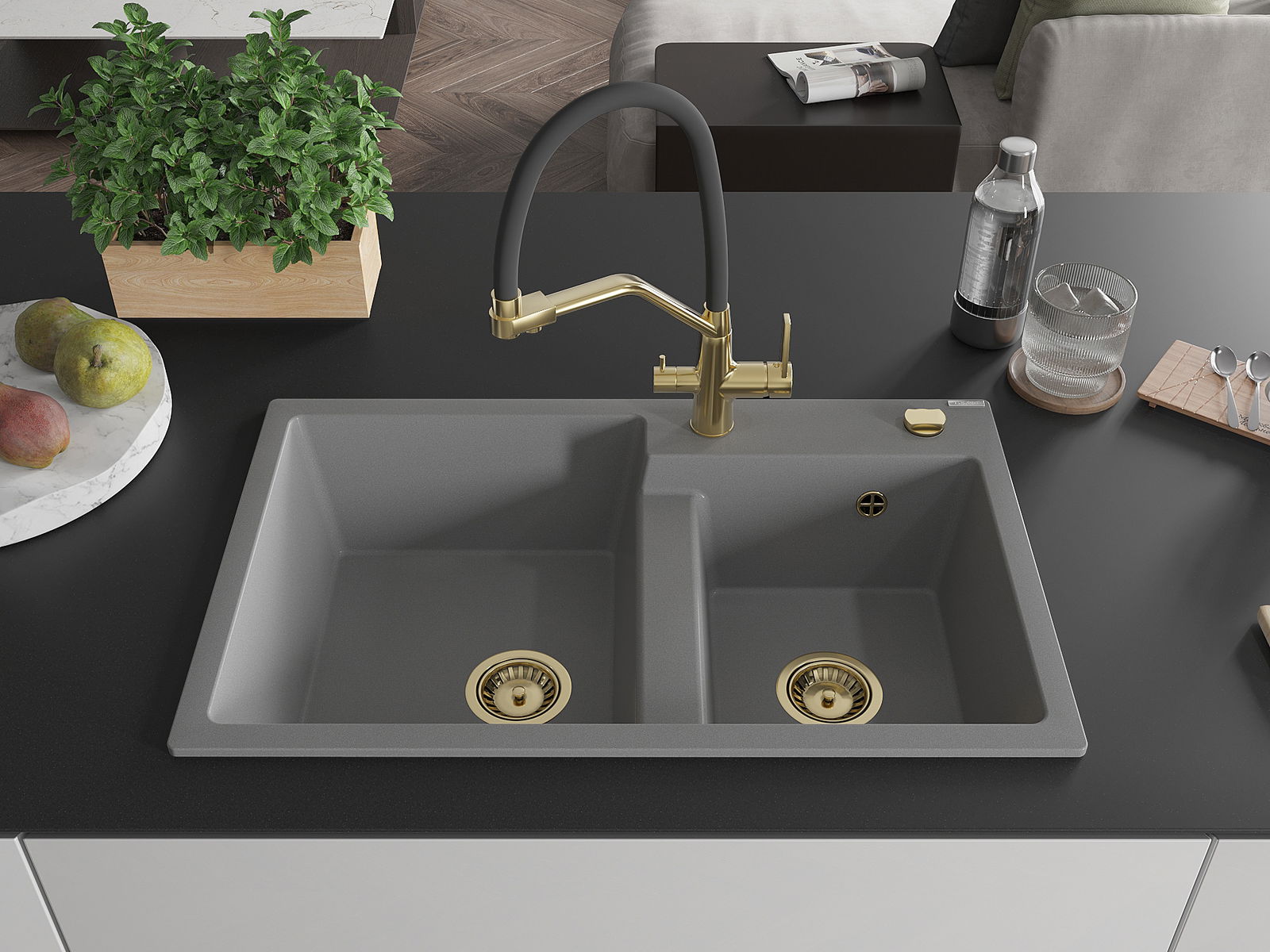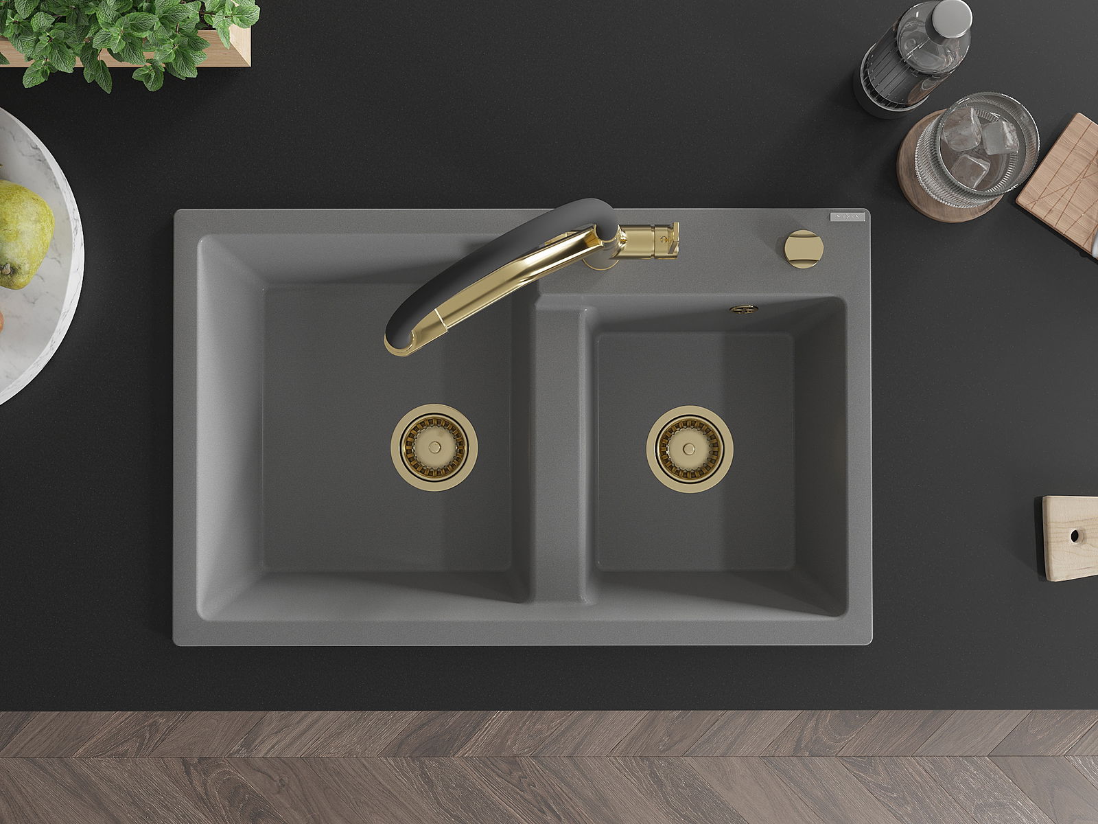 Mexen Tomas granite 2-bowl sink with Duo kitchen tap, grey - 6516-71-671701-57-G
