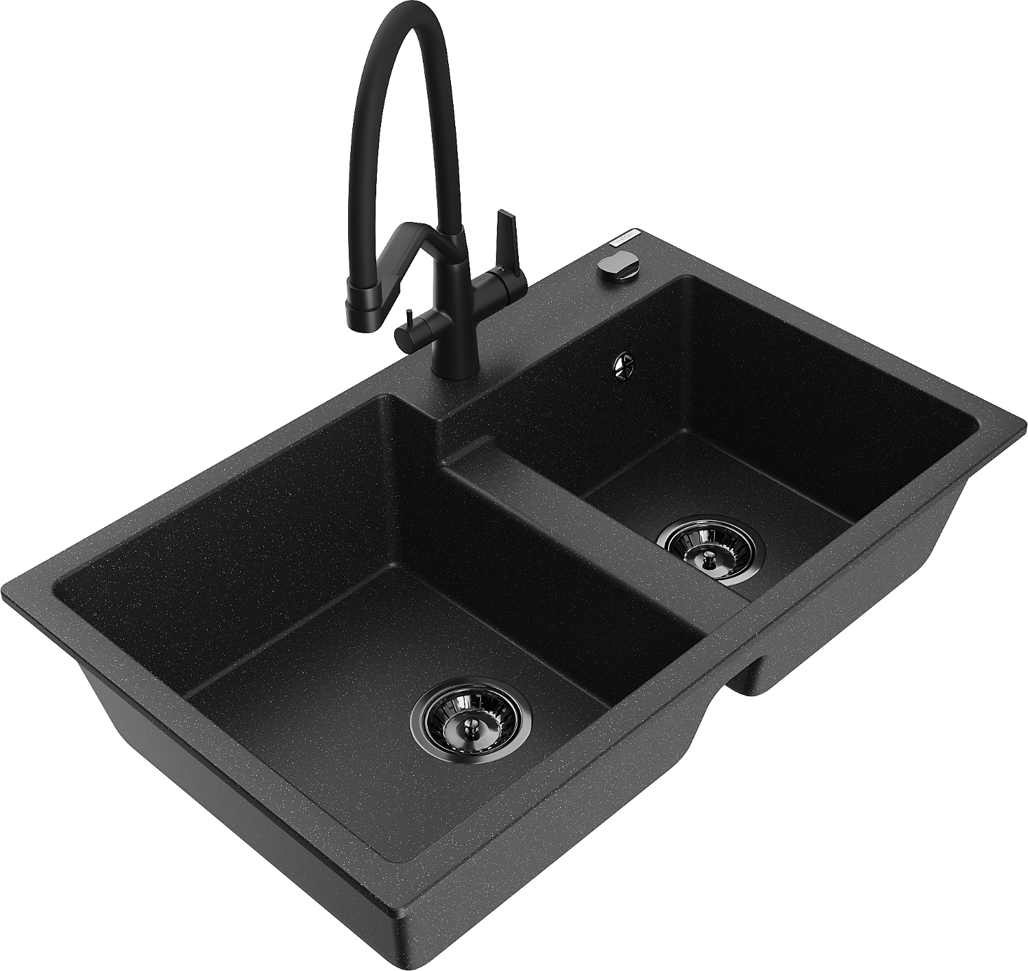 Mexen Tomas granite 2-bowl kitchen sink with Duo tap, black/silver metallic - 6516-73-671701-70-B