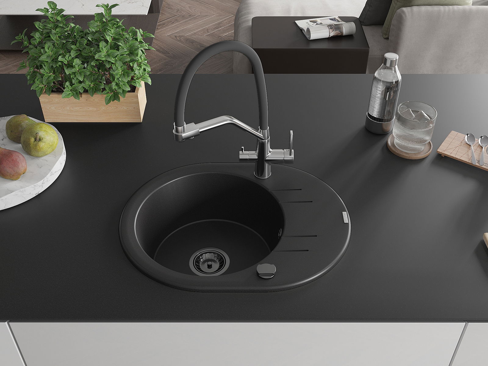 The sink is made of high quality granite. It is an elegant and, above all, practical complement to every kitchen, regardless of its style. High quality and granite durability ensure many years of use.