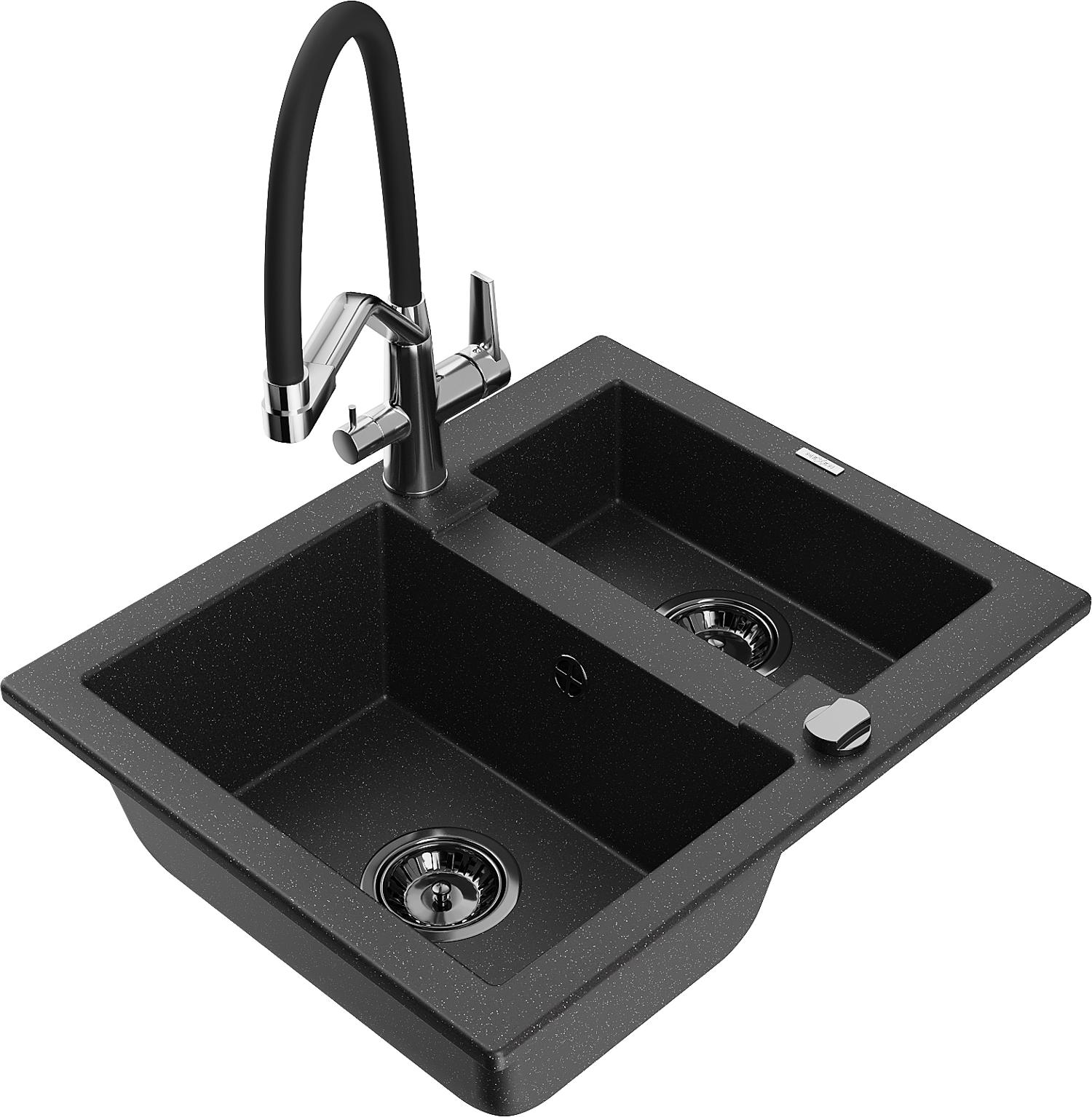 Mexen Carlos 1.5-bowl granite sink with Duo kitchen tap, black/silver metallic - 6518-73-671701-07-B