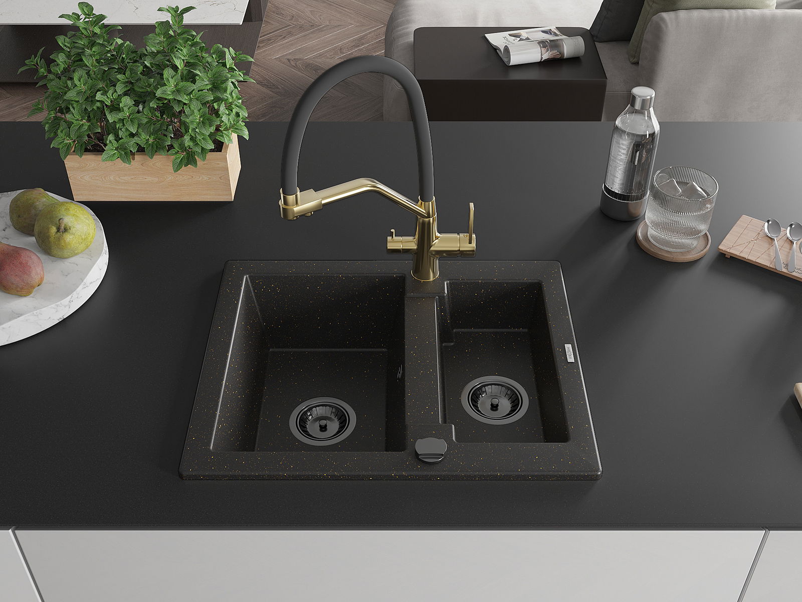 Mexen Carlos 1.5-bowl granite sink with Duo kitchen mixer, black/gold metallic - 6518-75-671701-57-B