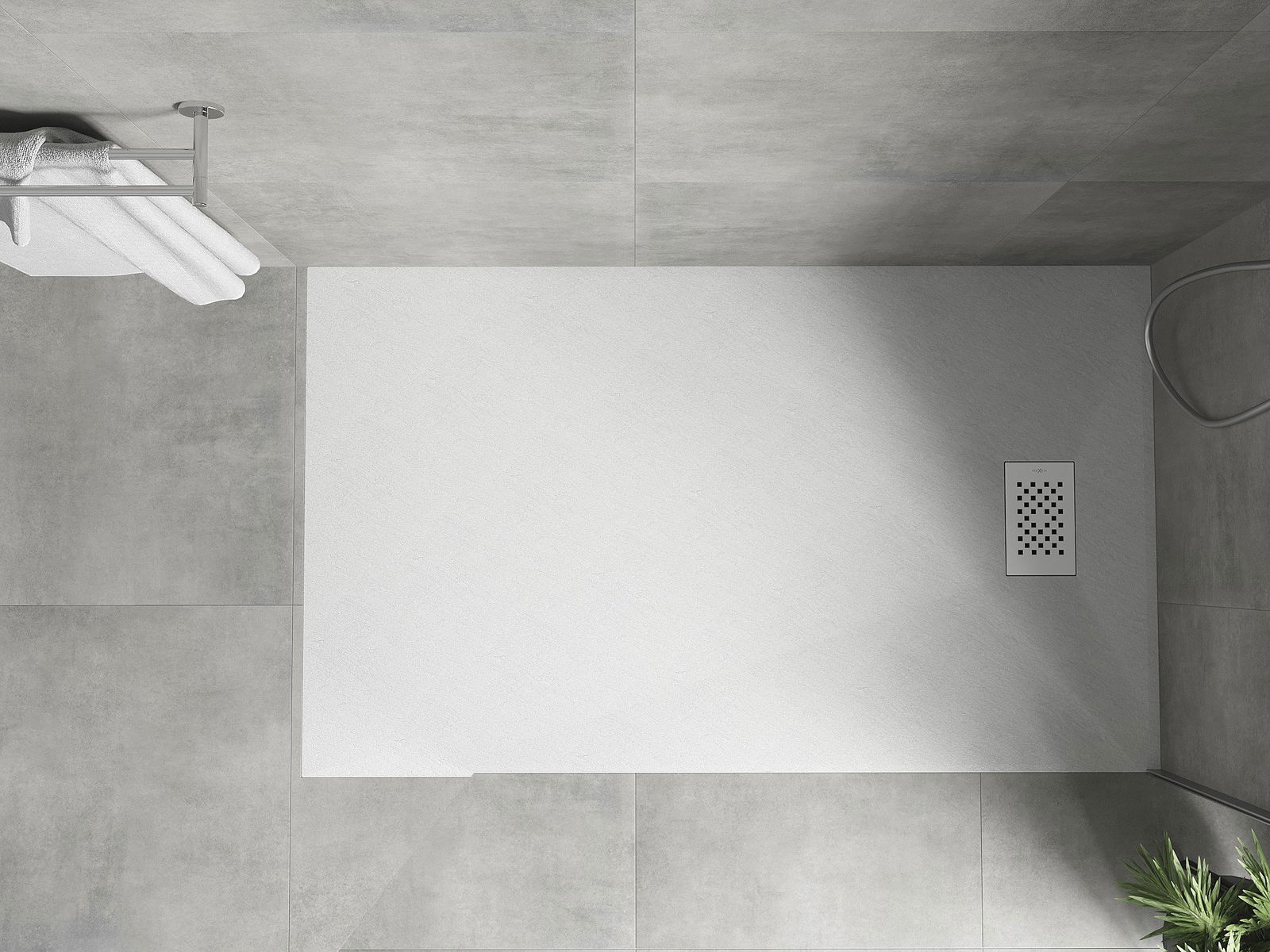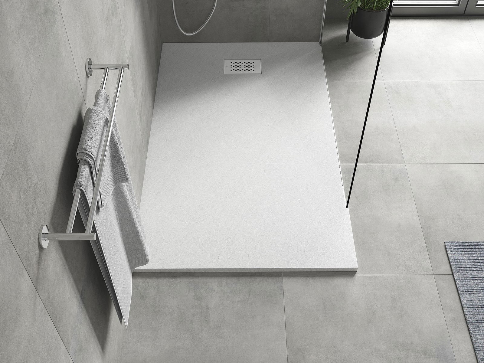 The surface of the shower tray resembles a stone with its structure. It is a unique combination of natural appearance with a modern interior arrangement. It adds character, emphasizes the aesthetics and elegance of the bathroom decor and impresses with its form.