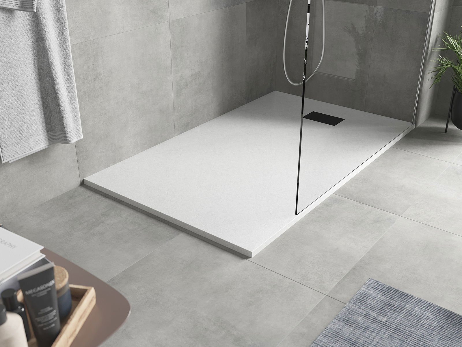 The surface of the shower tray resembles a stone with its structure. It is a unique combination of natural appearance with a modern interior arrangement. It adds character, emphasizes the aesthetics and elegance of the bathroom decor and impresses with its form.