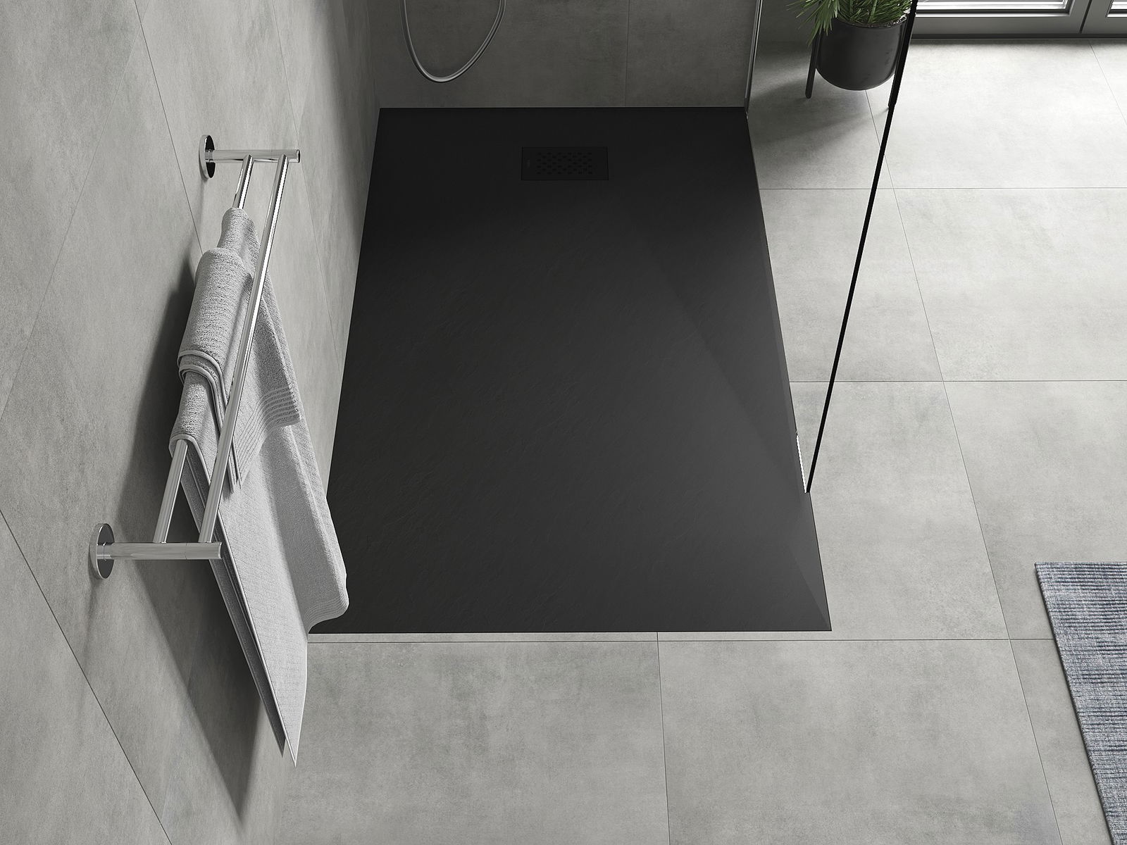 The surface of the shower tray resembles a stone with its structure. It is a unique combination of natural appearance with a modern interior arrangement. It adds character, emphasizes the aesthetics and elegance of the bathroom decor and impresses with its form.