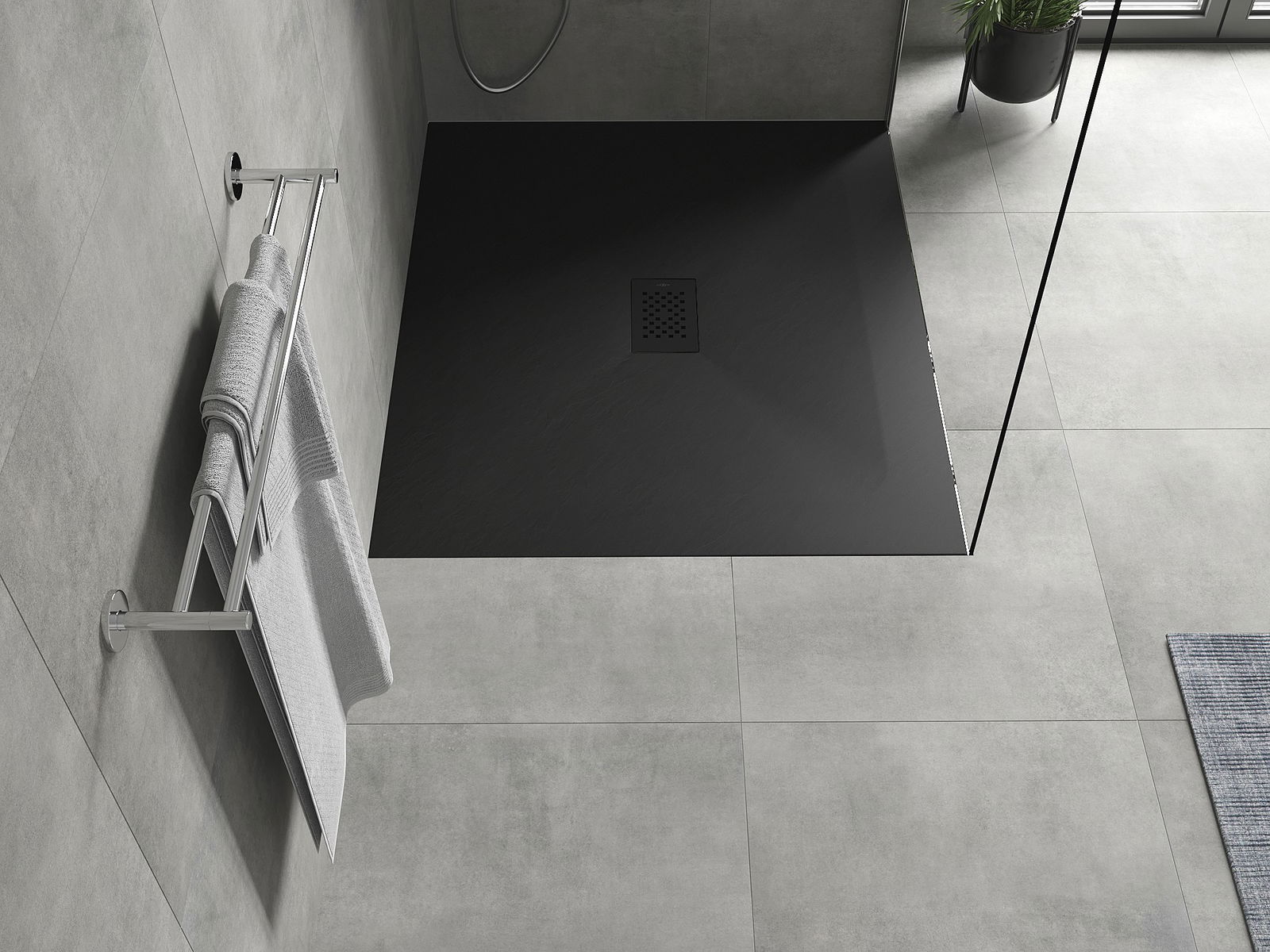 The surface of the shower tray resembles a stone with its structure. It is a unique combination of natural appearance with a modern interior arrangement. It adds character, emphasizes the aesthetics and elegance of the bathroom decor and impresses with its form.