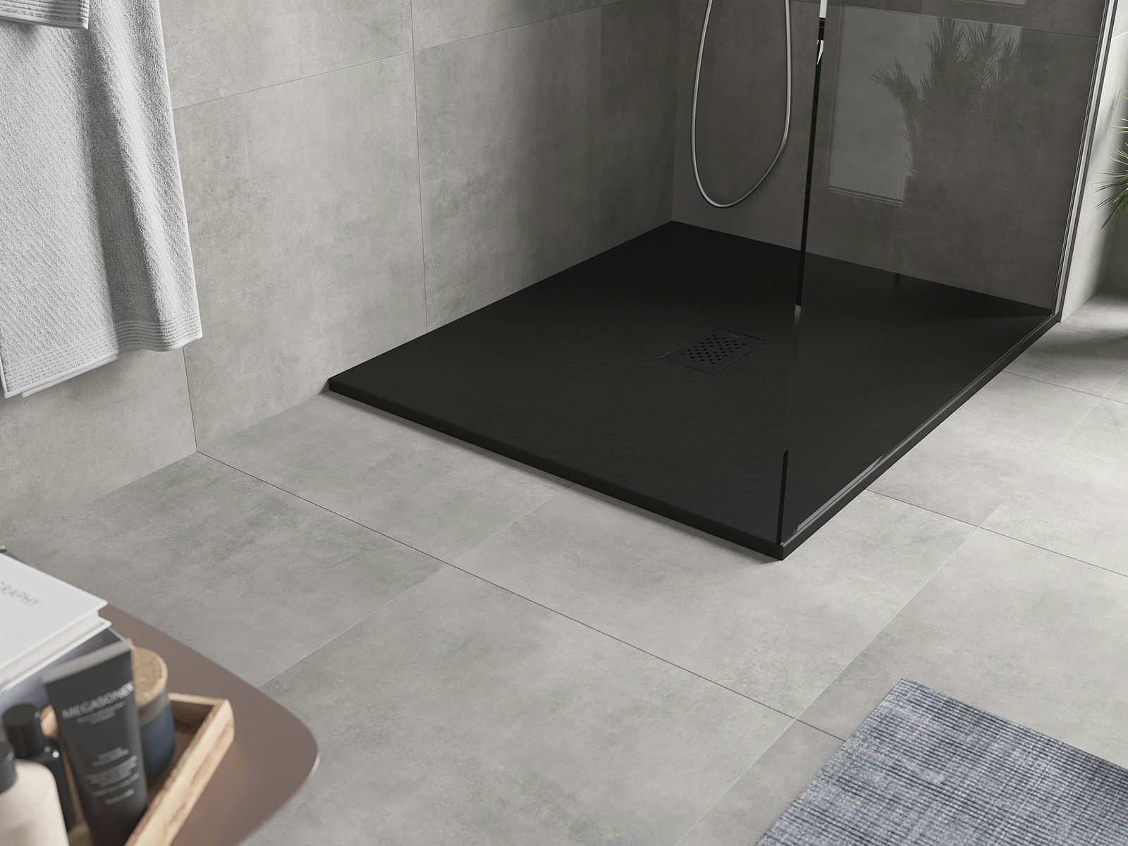 The surface of the shower tray resembles a stone with its structure. It is a unique combination of natural appearance with a modern interior arrangement. It adds character, emphasizes the aesthetics and elegance of the bathroom decor and impresses with its form.