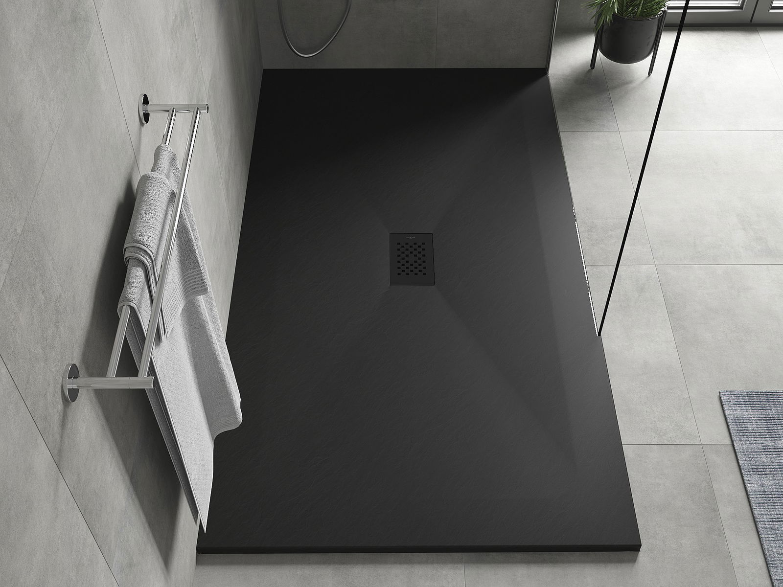 The surface of the shower tray resembles a stone with its structure. It is a unique combination of natural appearance with a modern interior arrangement. It adds character, emphasizes the aesthetics and elegance of the bathroom decor and impresses with its form.