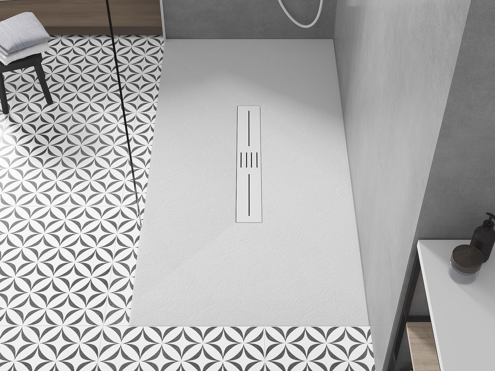 The surface of the shower tray resembles a stone with its structure. It is a unique combination of natural appearance with a modern interior arrangement. It adds character, emphasizes the aesthetics and elegance of the bathroom decor and impresses with its form.