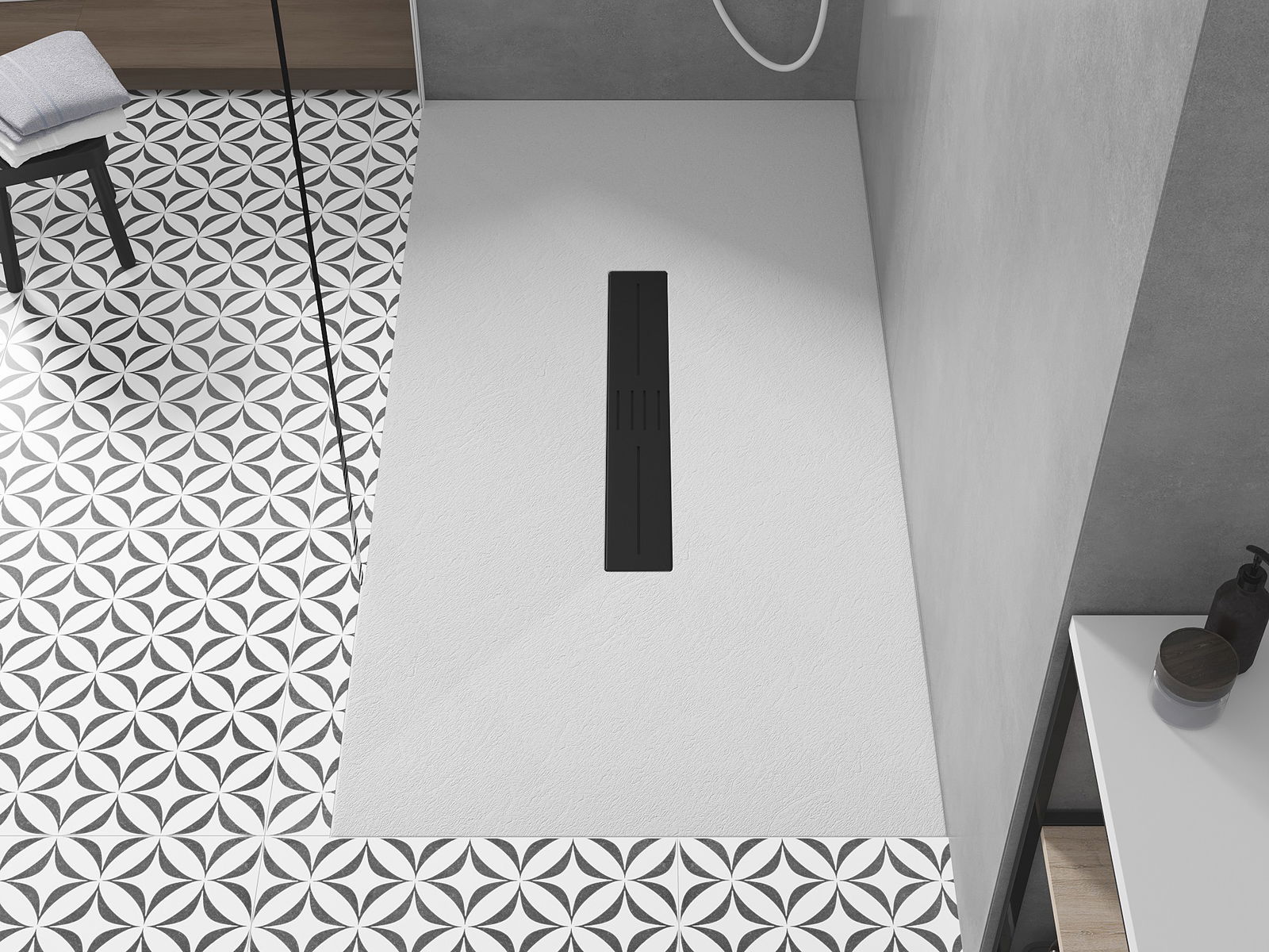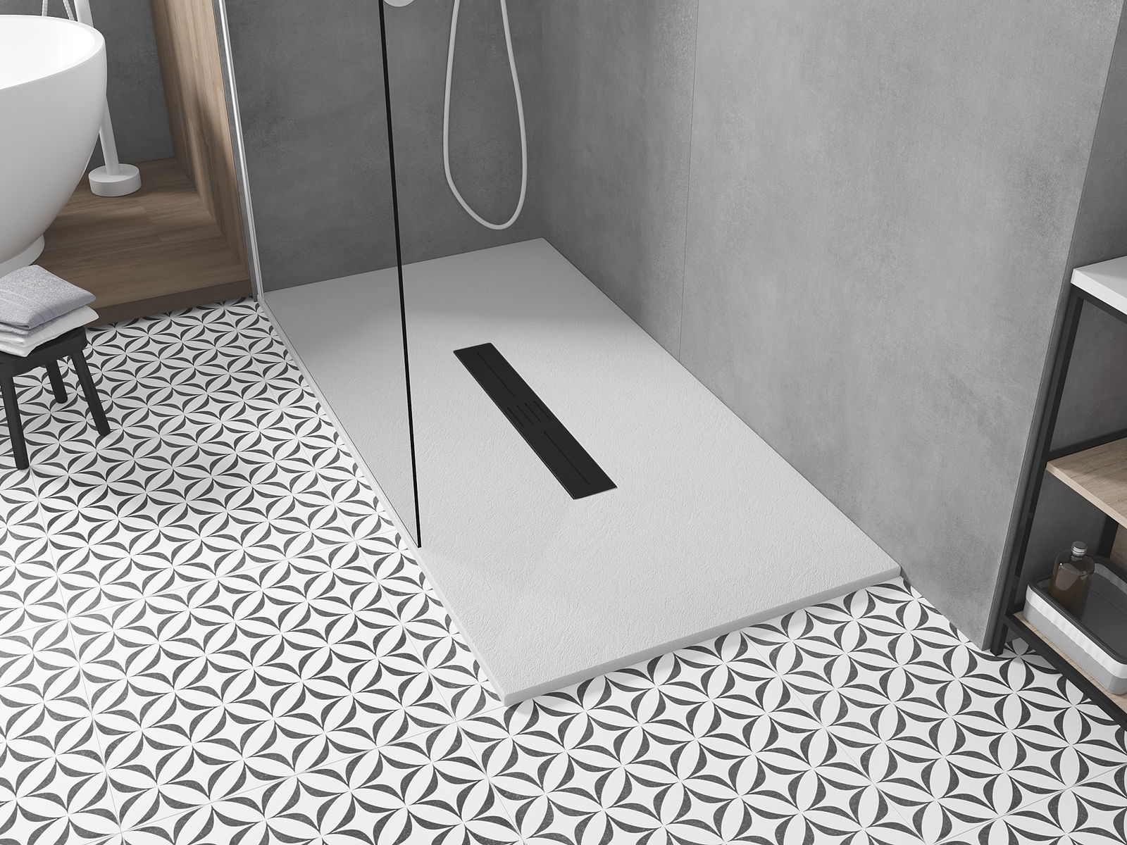 The surface of the shower tray resembles a stone with its structure. It is a unique combination of natural appearance with a modern interior arrangement. It adds character, emphasizes the aesthetics and elegance of the bathroom decor and impresses with its form.