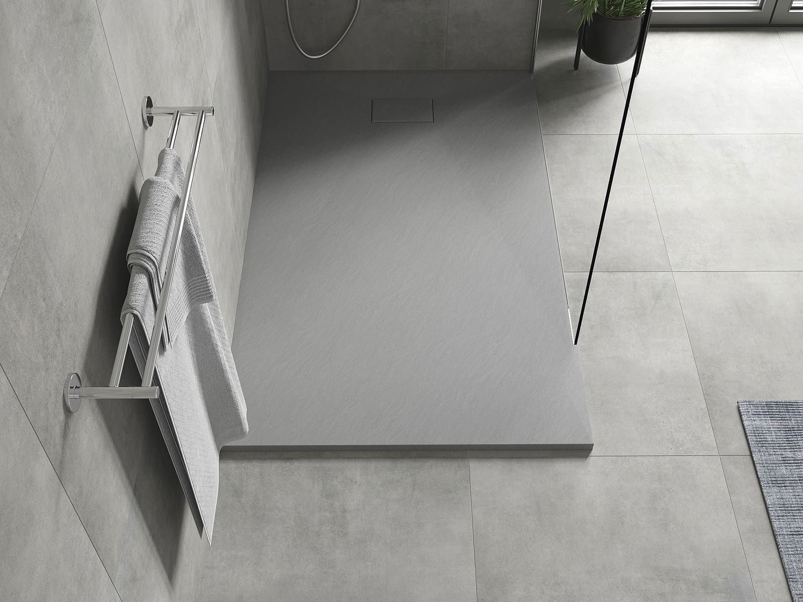 The surface of the shower tray resembles a stone with its structure. It is a unique combination of natural appearance with a modern interior arrangement. It adds character, emphasizes the aesthetics and elegance of the bathroom decor and impresses with its form.