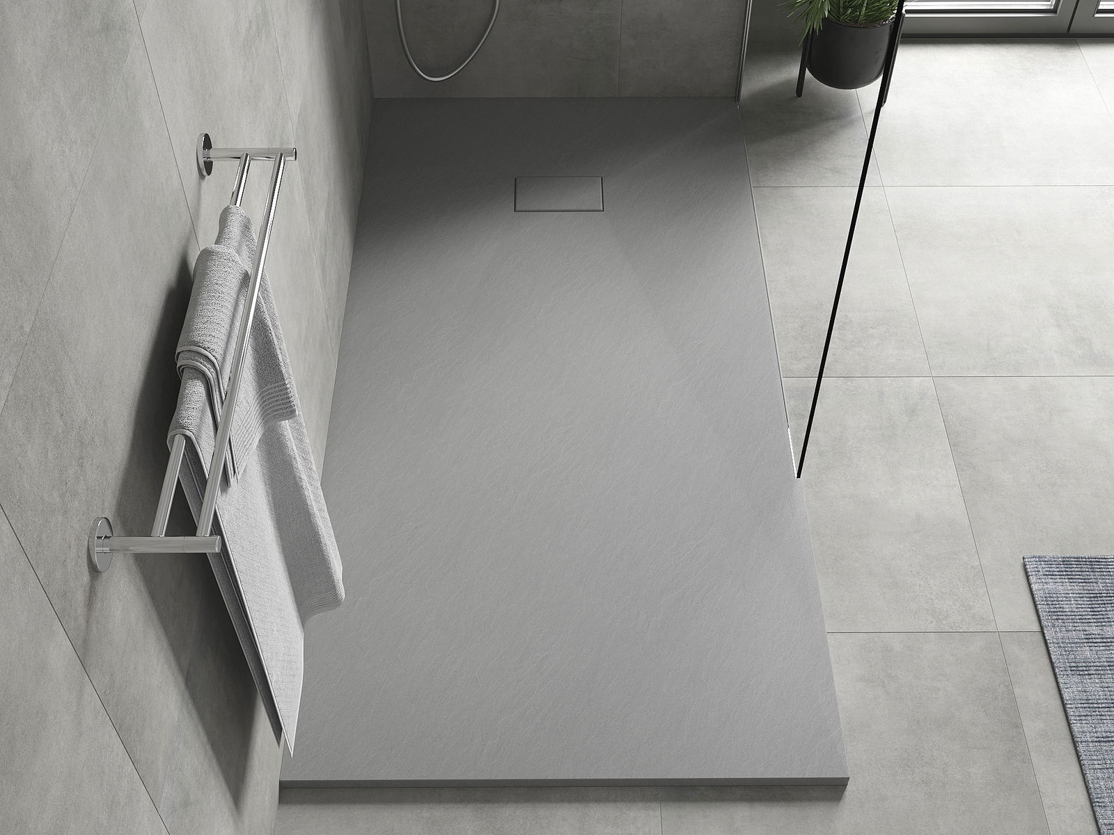 The surface of the shower tray resembles a stone with its structure. It is a unique combination of natural appearance with a modern interior arrangement. It adds character, emphasizes the aesthetics and elegance of the bathroom decor and impresses with its form.