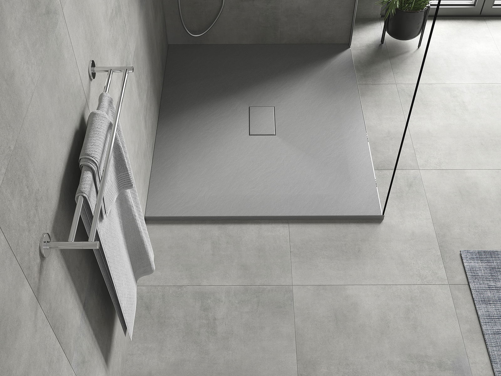 The surface of the shower tray resembles a stone with its structure. It is a unique combination of natural appearance with a modern interior arrangement. It adds character, emphasizes the aesthetics and elegance of the bathroom decor and impresses with its form.