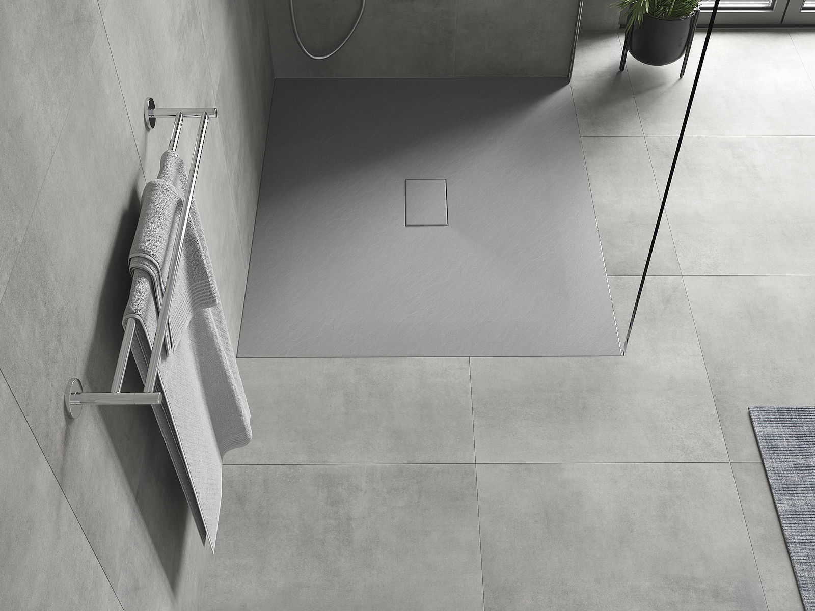 The surface of the shower tray resembles a stone with its structure. It is a unique combination of natural appearance with a modern interior arrangement. It adds character, emphasizes the aesthetics and elegance of the bathroom decor and impresses with its form.
