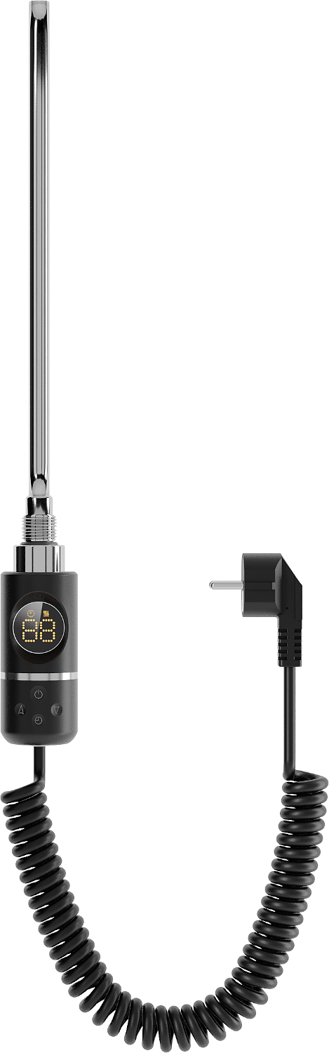 Mexen FA-I is a 600 W electric heater in black. Its total length is 656 mm, and the heating element length is 540 mm. It operates on 230V/50 Hz voltage and has a 1.5 m connection cable. The heater has a G 1/2" thread and protection class IP44. It features an LED display, parental lock, and dry-run protection. Sensitive and Comfort functions allow temperature adjustment and drying options.