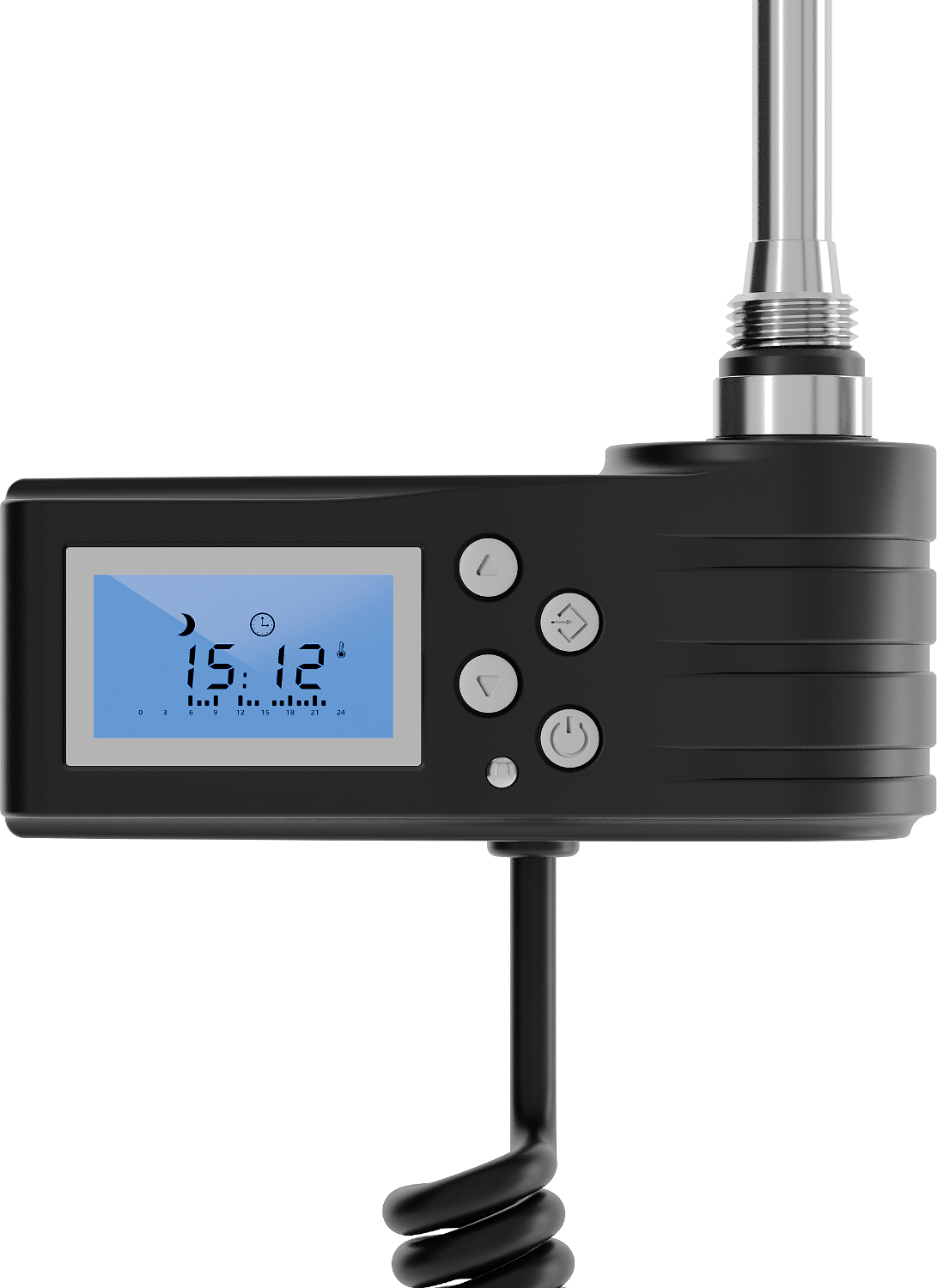 Mexen FA-J1229 is a modern 450 W electric heater in an elegant black colour. It features an LED display and functions such as Sensitive, Comfort, Smart, ECO, Anti-frost, and parental lock. The total length is 490 mm, heating element length 415 mm, connection cable 1.5 m, thread G 1/2", protection rating IP44. Allows precise temperature setting, drying, weekly schedule, and remote control via app. Ideal for modernising any interior.