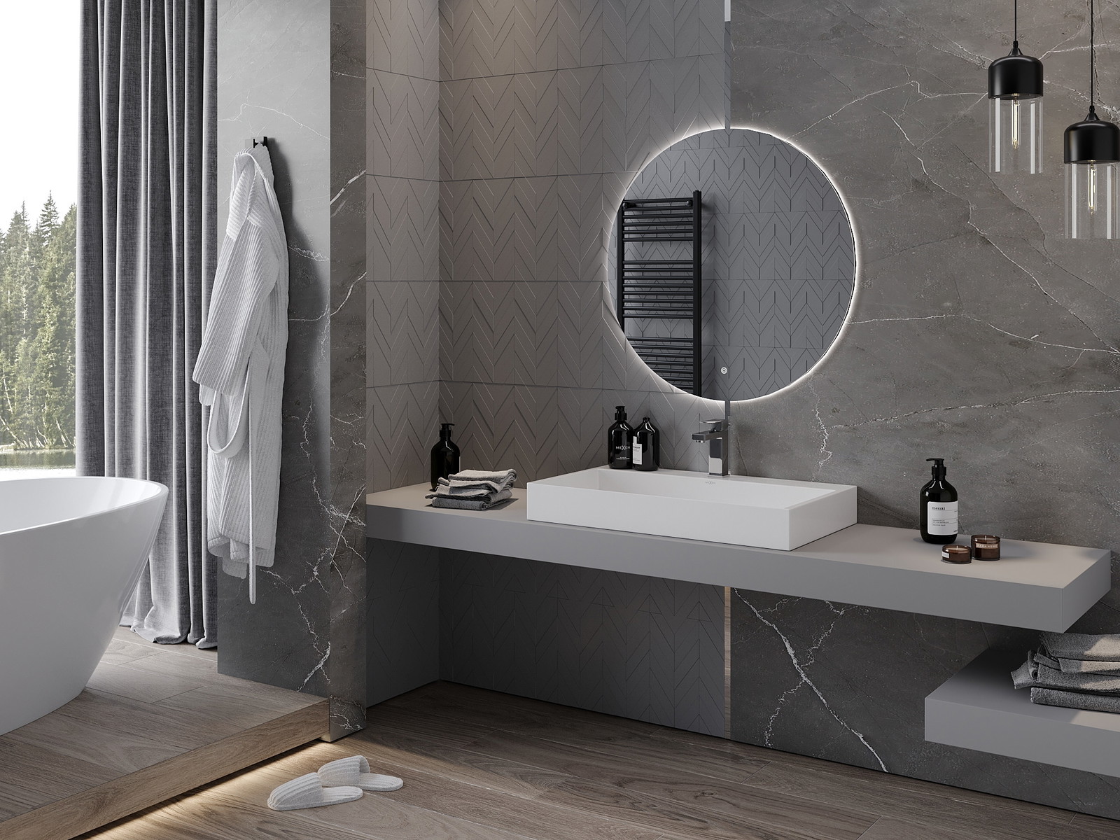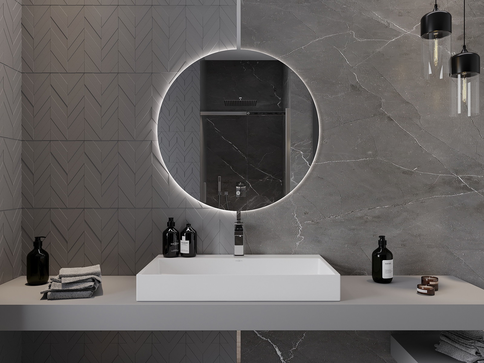 LED backlighting at the mirror is a practical element that makes daily grooming easier by providing the perfect illumination of the face. The backlighting gives the bathroom a modern finish, highlighting its elegant decor.