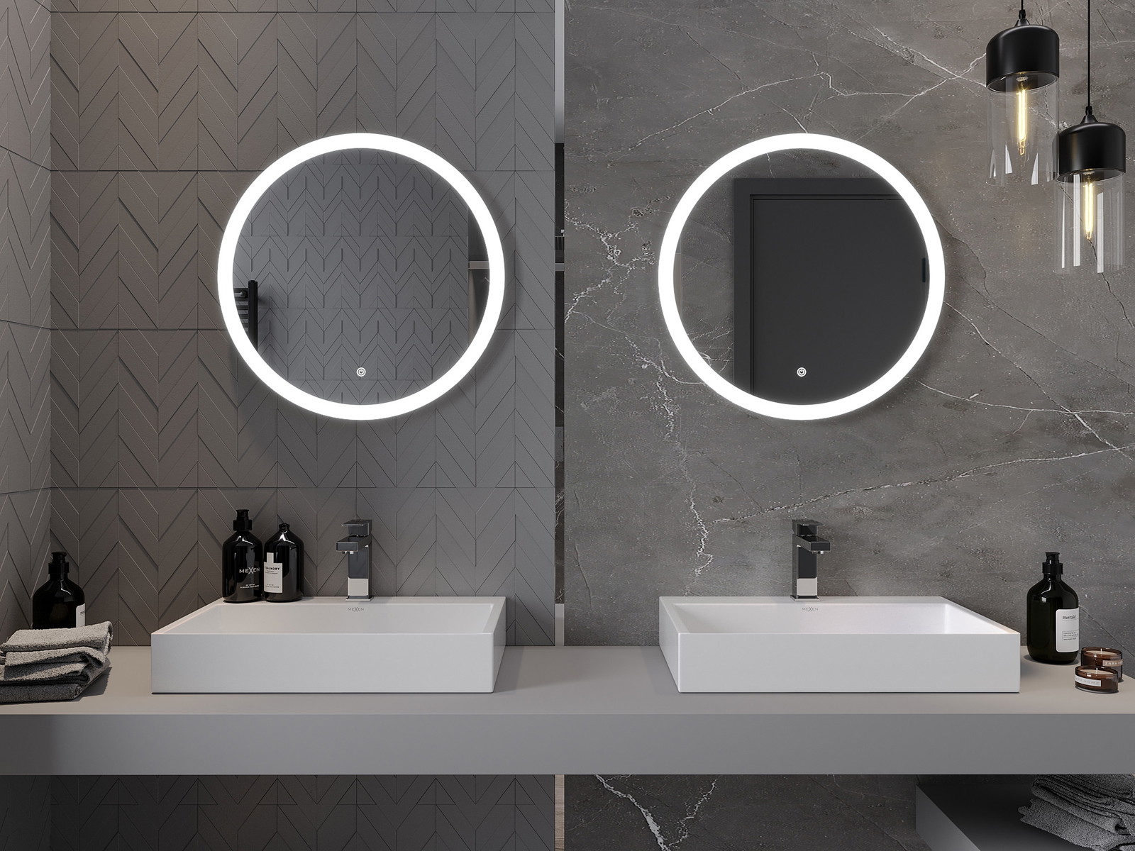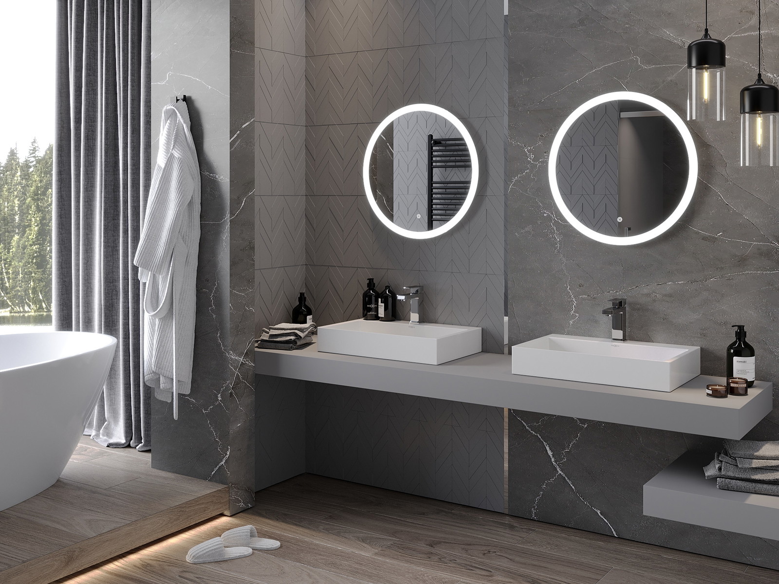 LED backlighting at the mirror is a practical element that makes daily grooming easier by providing the perfect illumination of the face. The backlighting gives the bathroom a modern finish, highlighting its elegant decor.