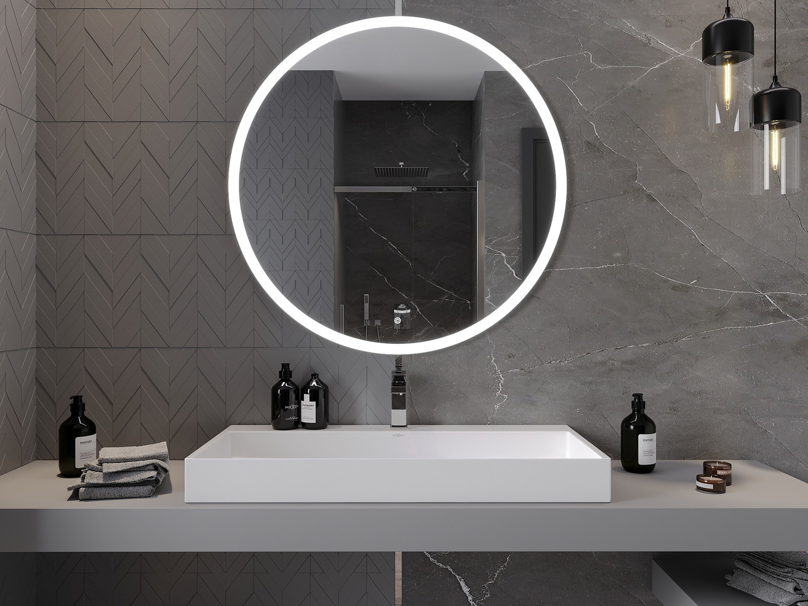 LED backlighting at the mirror is a practical element that makes daily grooming easier by providing the perfect illumination of the face. The backlighting gives the bathroom a modern finish, highlighting its elegant decor.