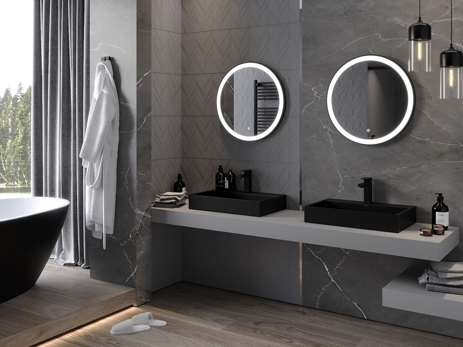 LED backlighting at the mirror is a practical element that makes daily grooming easier by providing the perfect illumination of the face. The backlighting gives the bathroom a modern finish, highlighting its elegant decor.