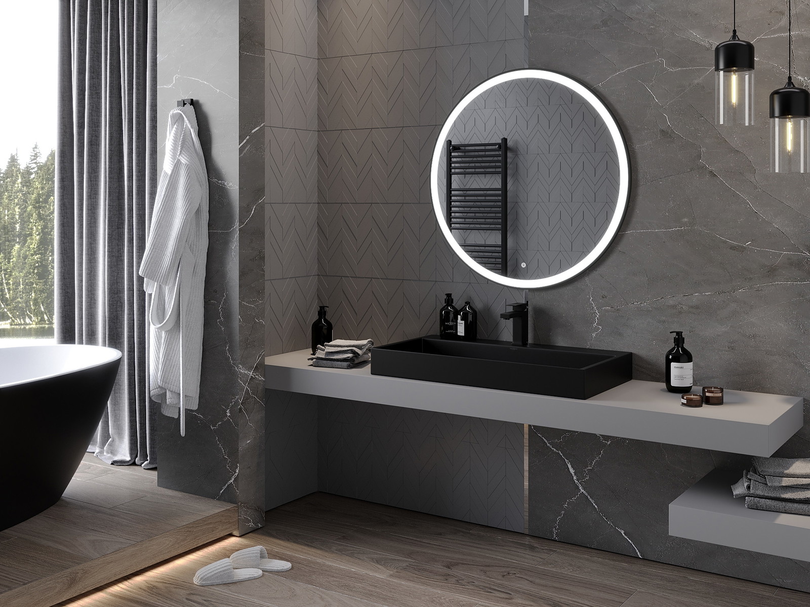 LED backlighting at the mirror is a practical element that makes daily grooming easier by providing the perfect illumination of the face. The backlighting gives the bathroom a modern finish, highlighting its elegant decor.