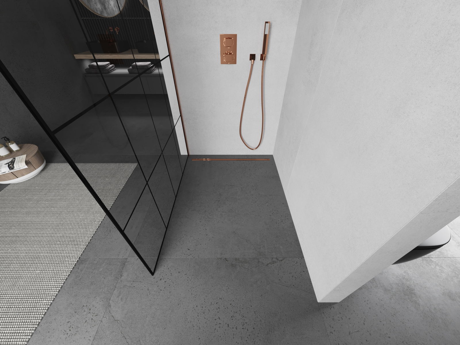 Mexen Kioto Walk-in shower wall 140 x 200 cm, black grid 8 mm, rose gold - 800-140-101-60-77