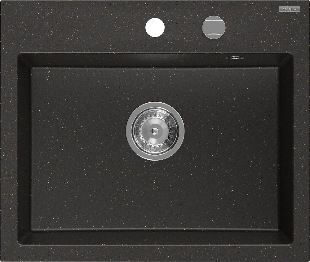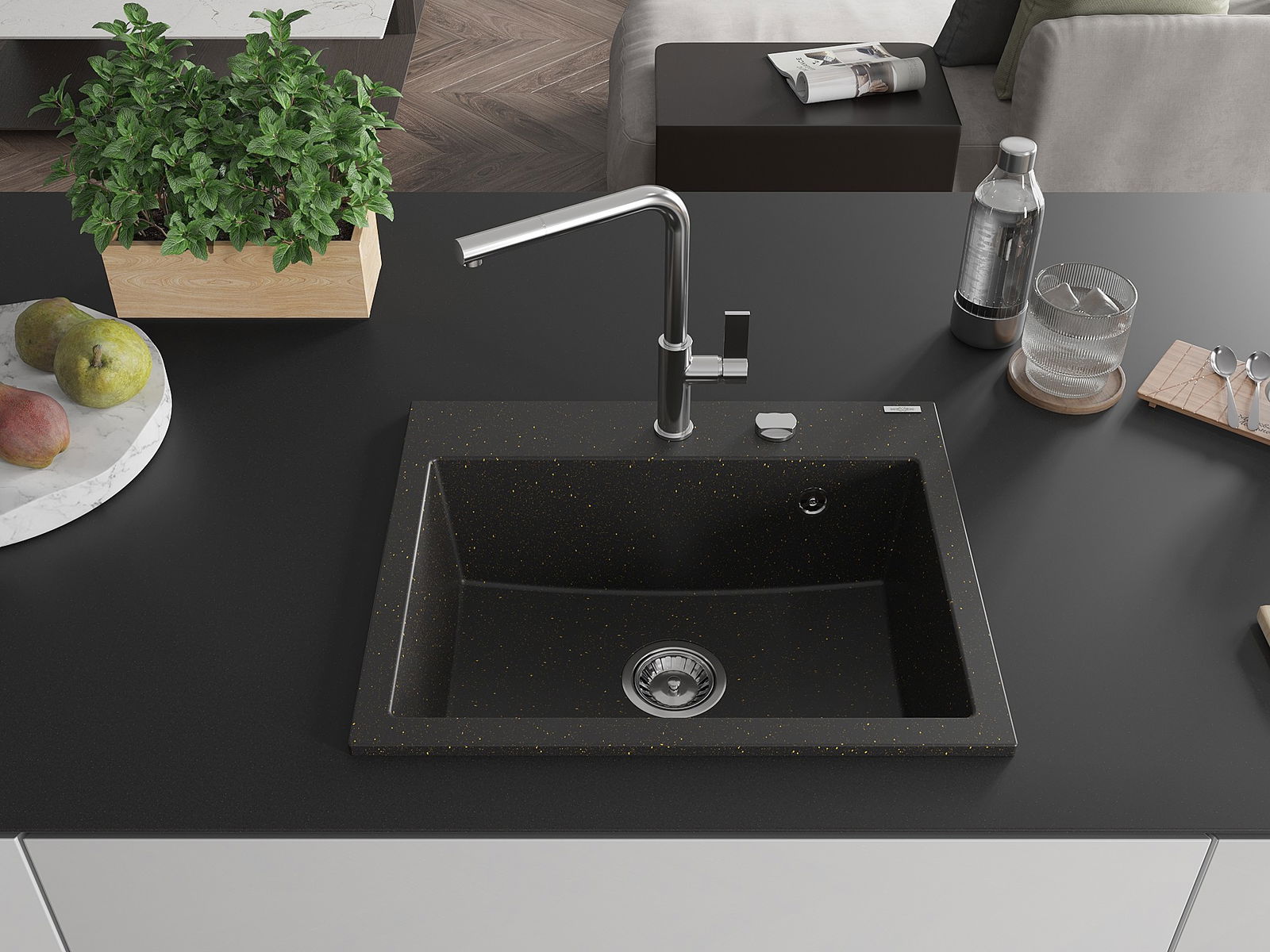 Mexen Oscar Granite Kitchen Sink 1-Bowl 580 x 490 mm, Black/Gold Metallic, Chrome Siphon - 6519581000-75