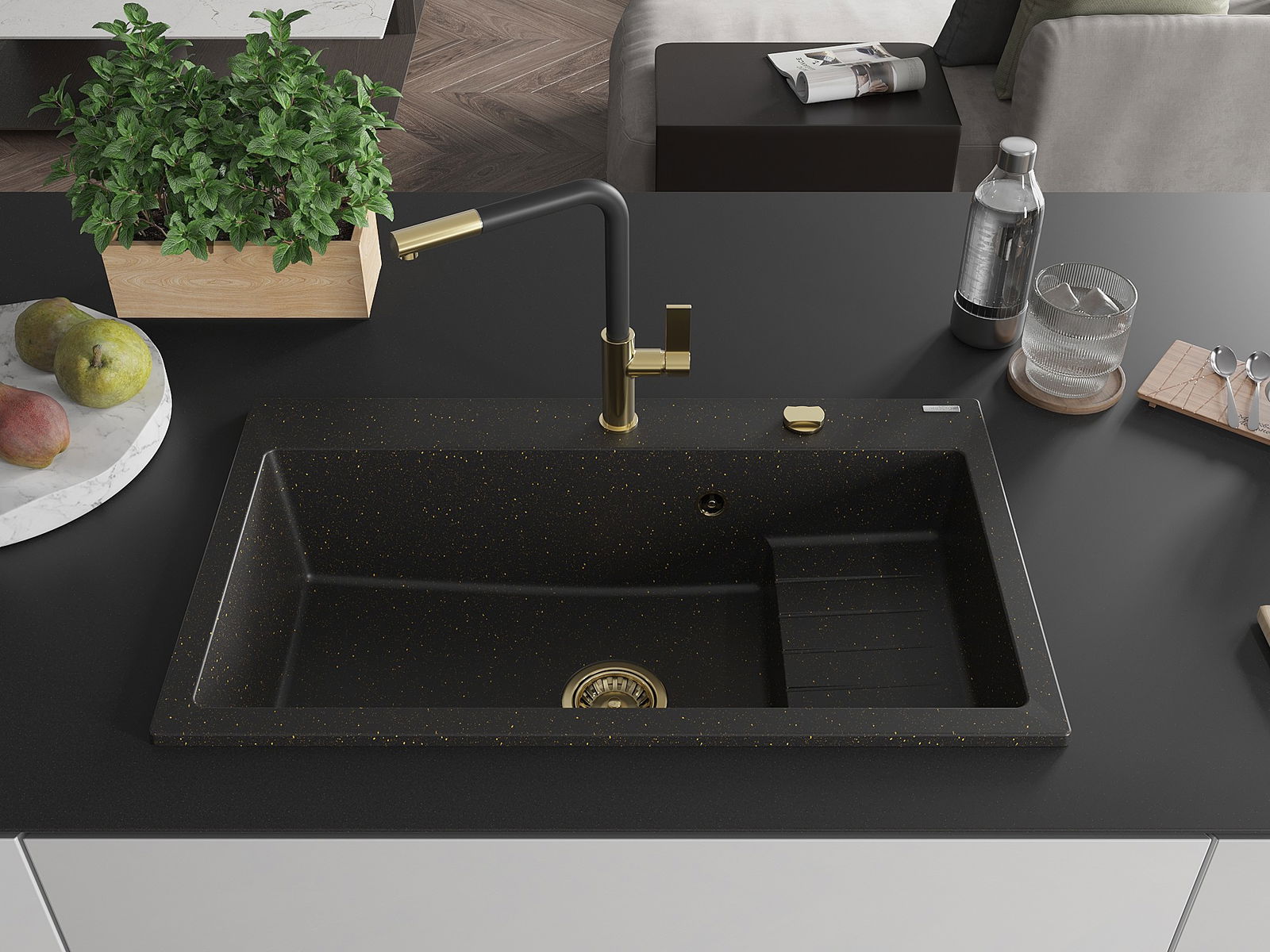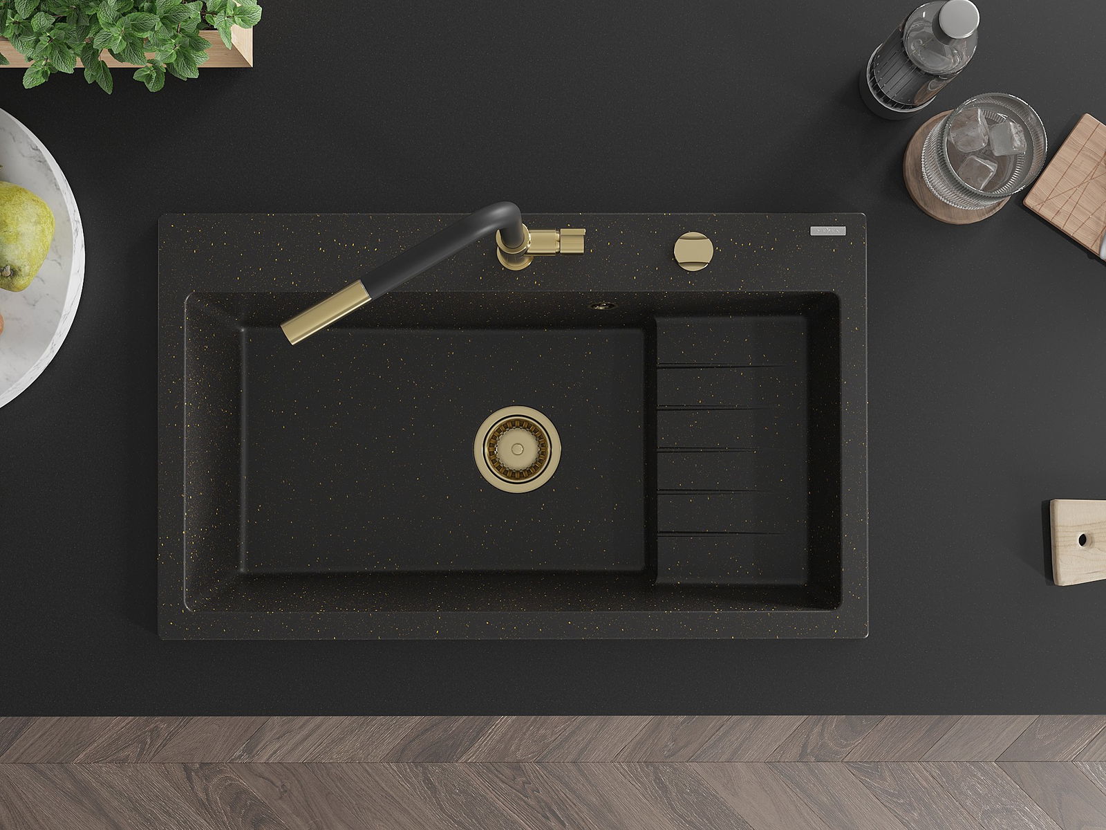 Mexen Omar granite sink 1-bowl 800 x 480 mm, black/gold metallic, gold siphon - 6520801005-75-G