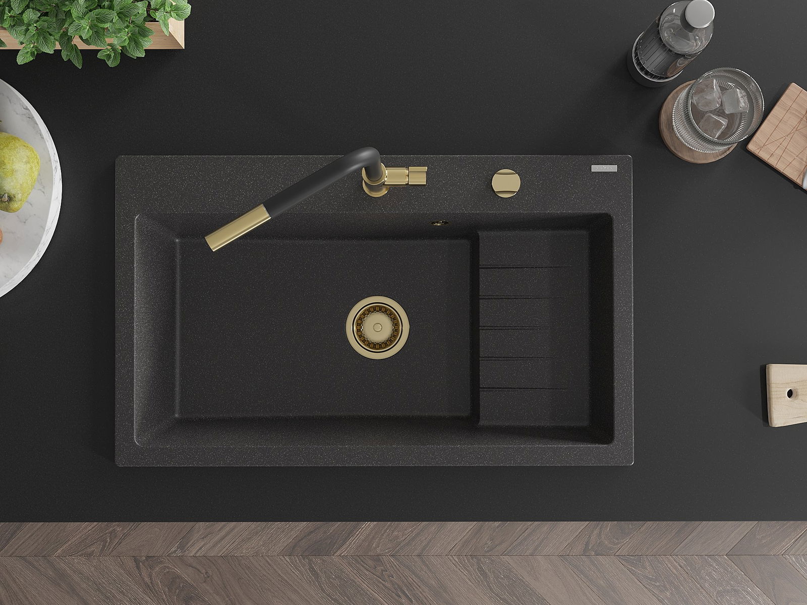 Mexen Omar 1-bowl granite kitchen sink 800 x 480 mm, black speckled, gold siphon - 6520801005-76-G