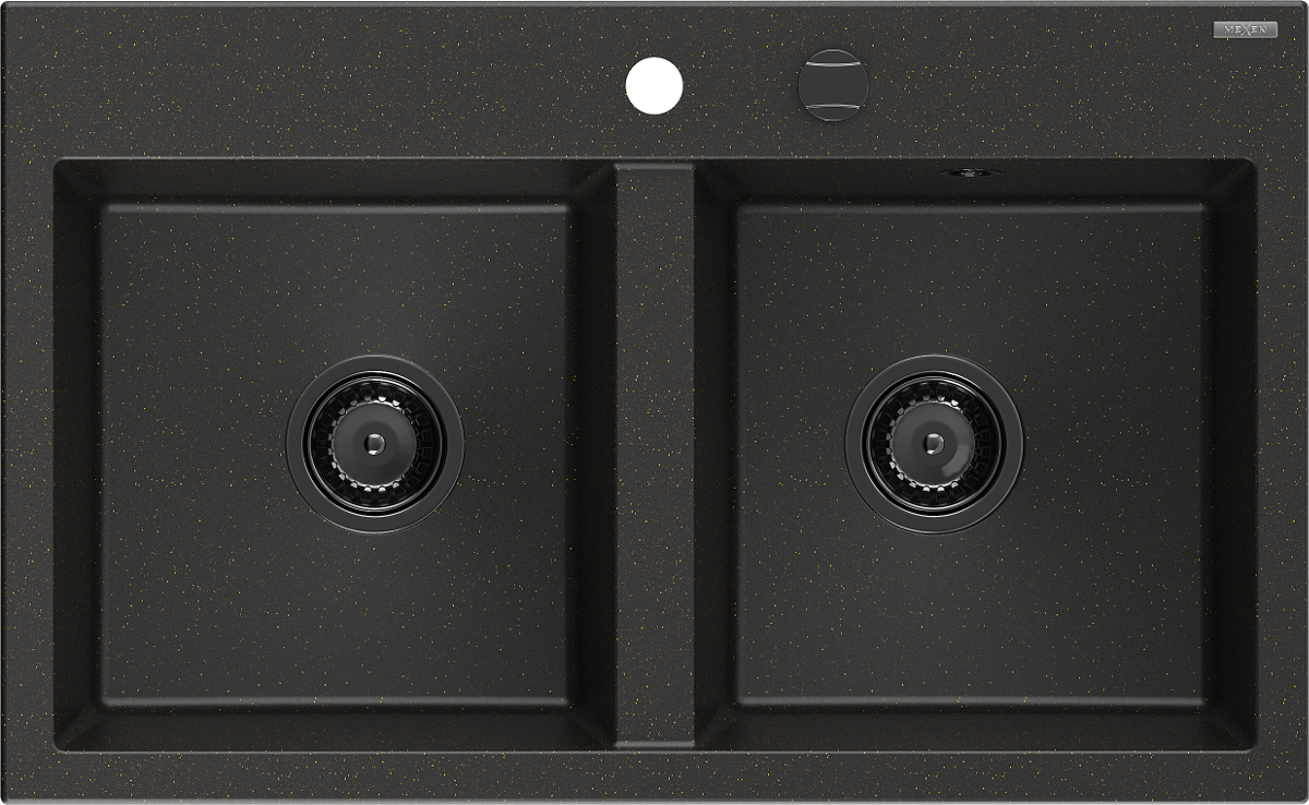 Mexen Hektor granite sink double-bowl 800 x 480 mm, black/gold metallic, black siphon - 6521802000-75-B
