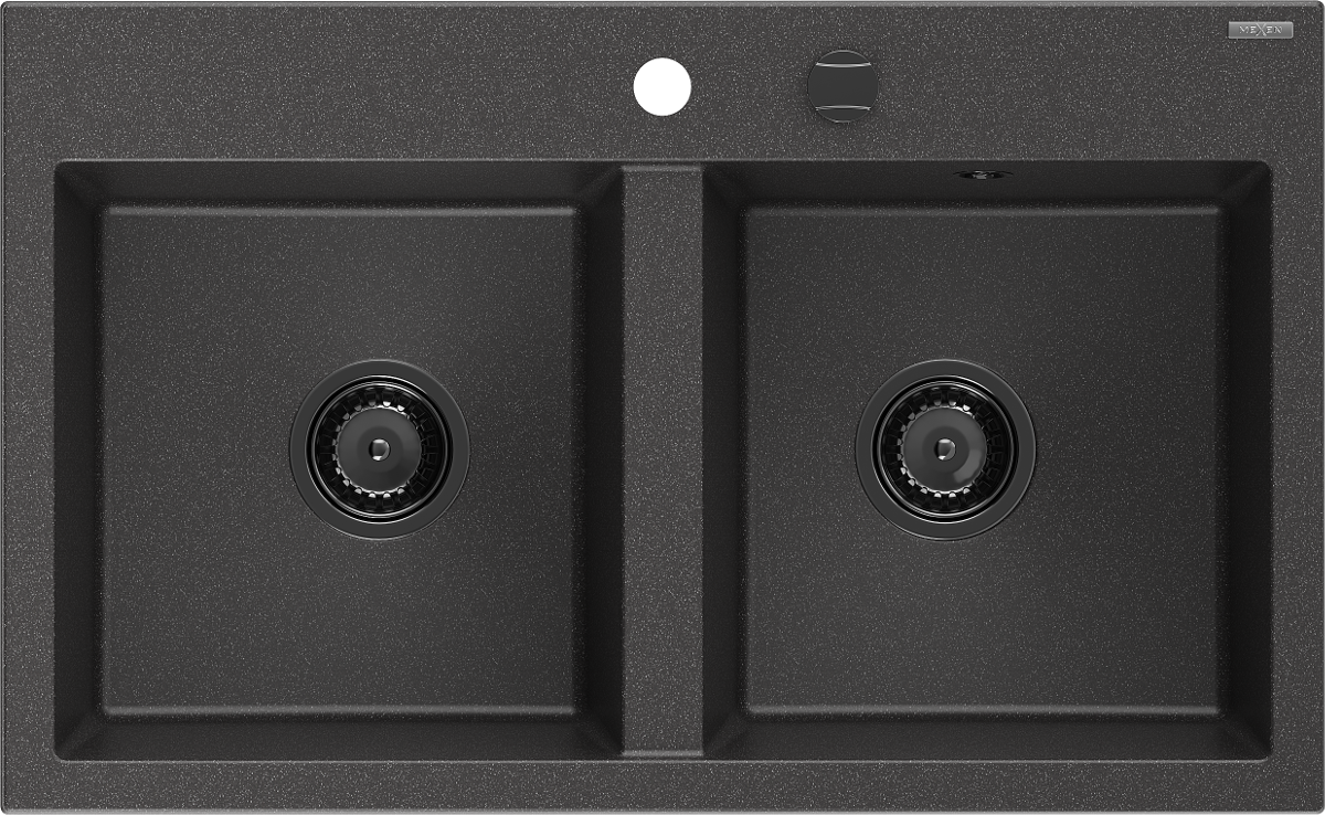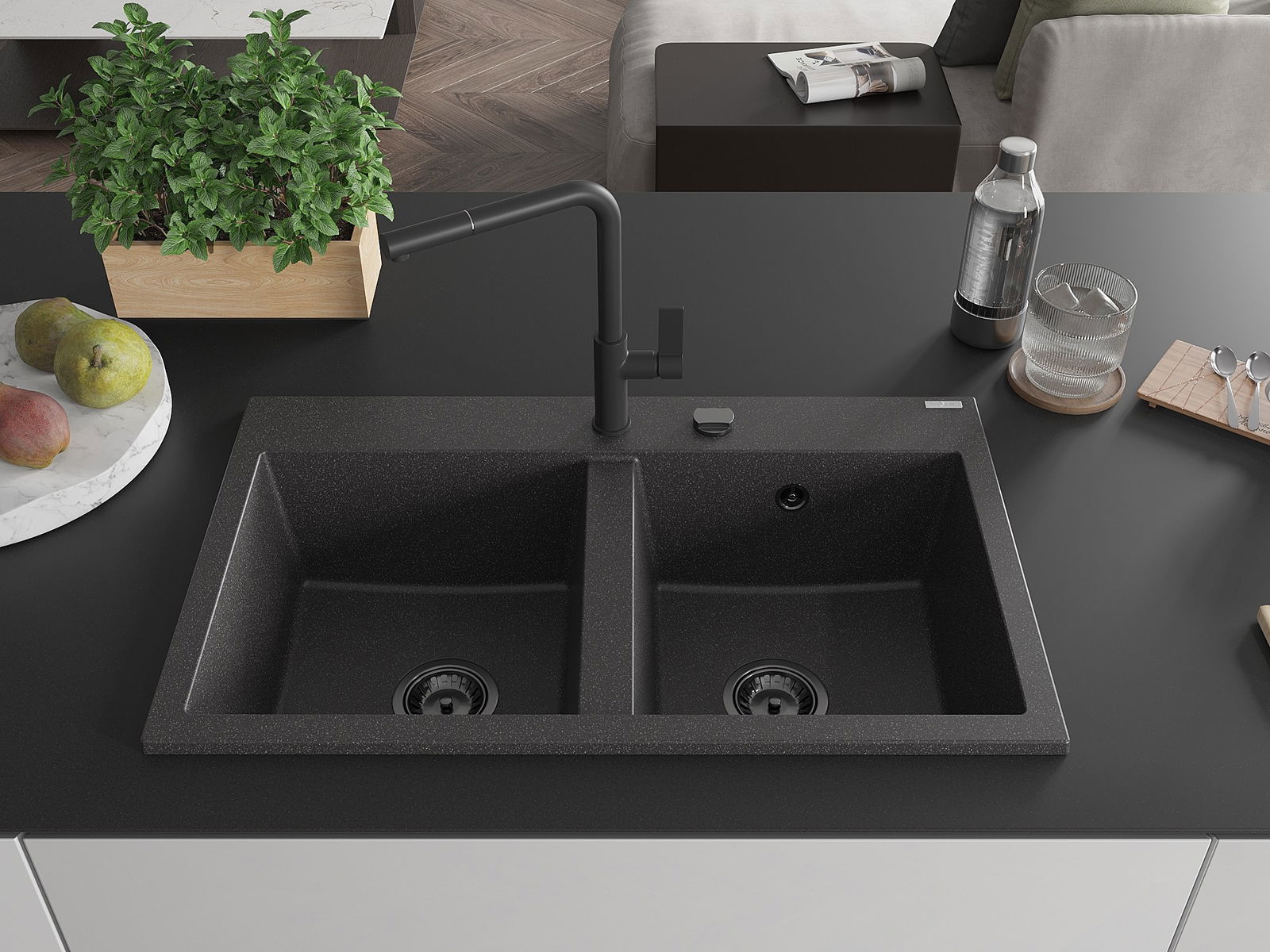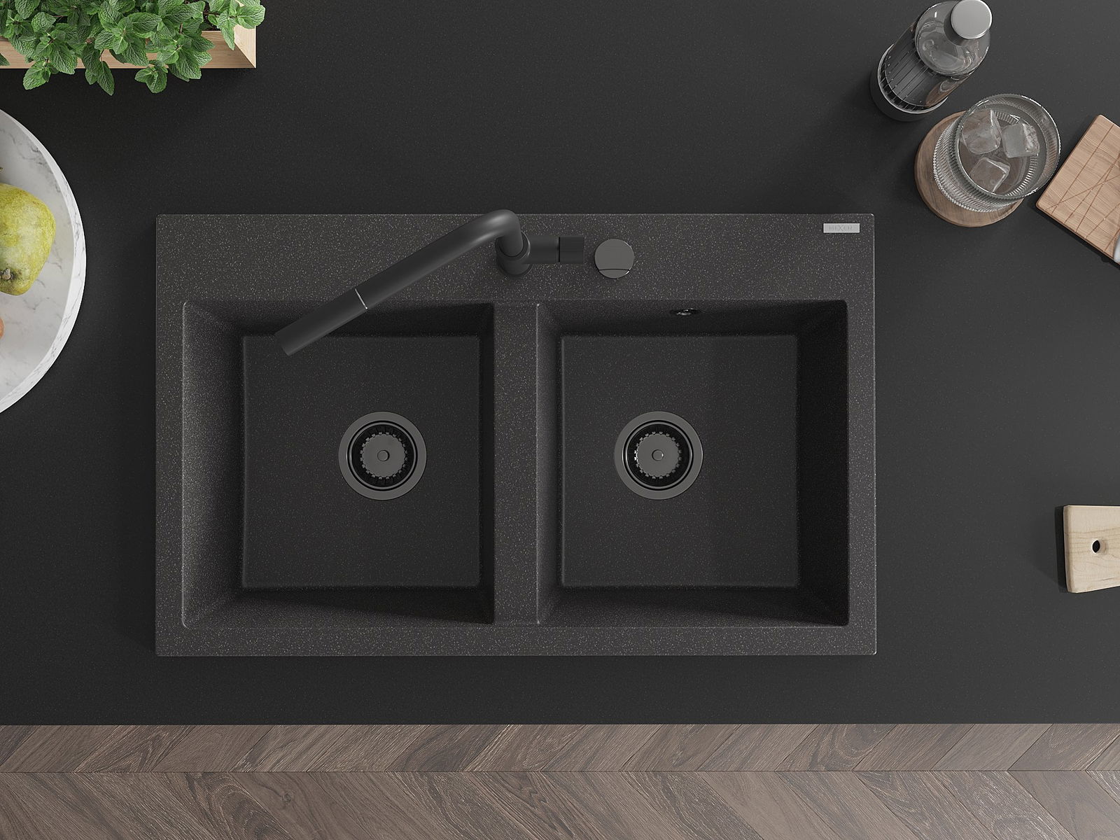 Mexen Hektor 2-Basin Granite Sink 800 x 480 mm, Black Speckled, Black Siphon - 6521802000-76-B