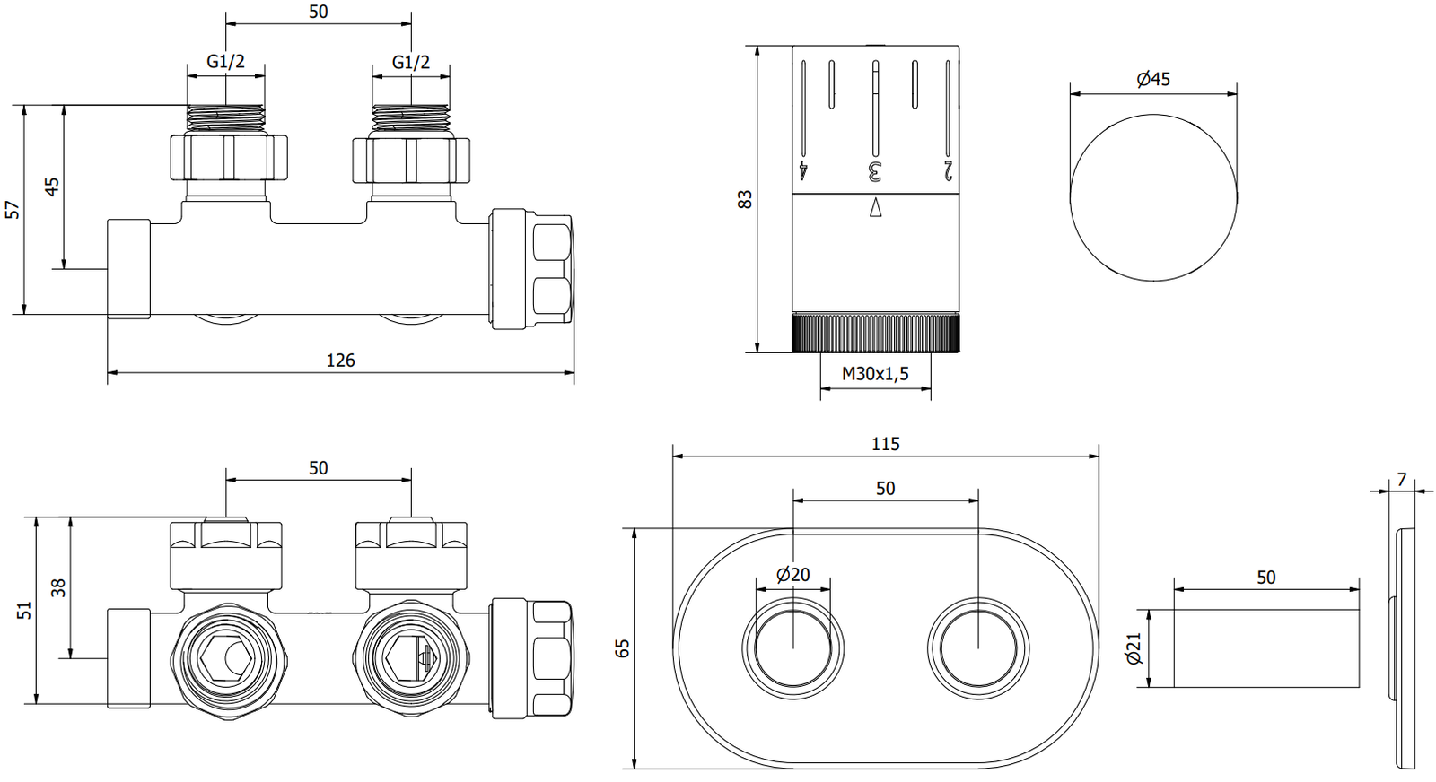Spacing of holes for radiator connections: 50 mm