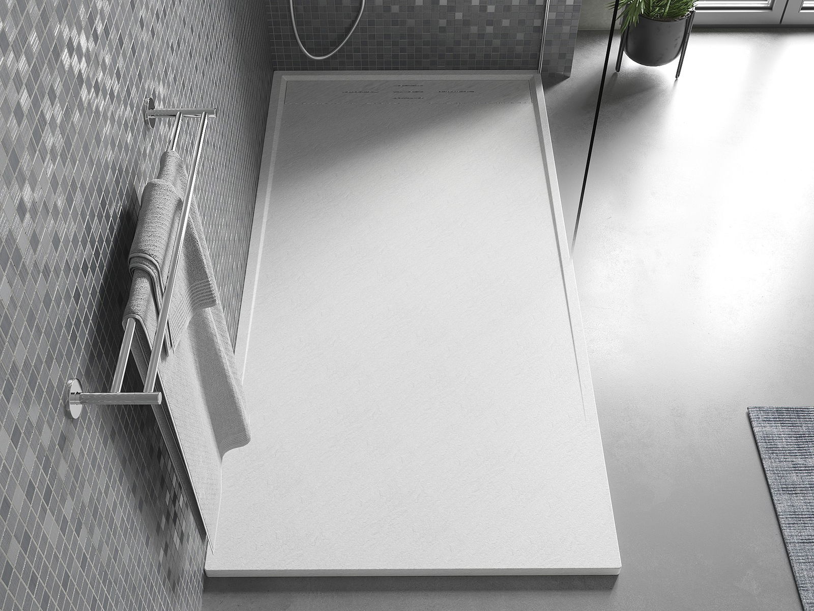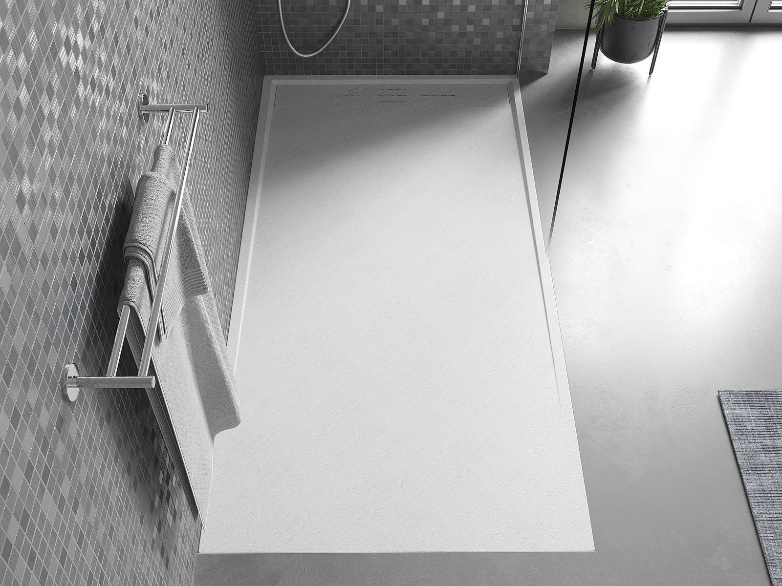 The surface of the shower tray resembles stone in its structure. It is a unique combination of a natural appearance with modern interior design. It adds character, enhances the aesthetics and elegance of the bathroom decor, and delights with its form.