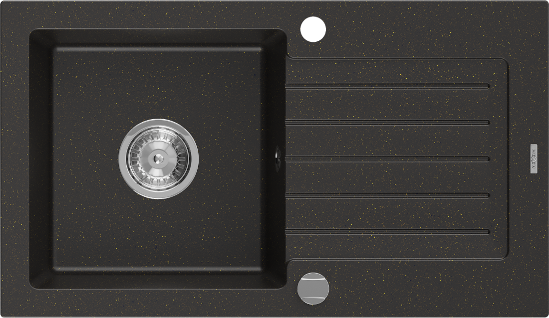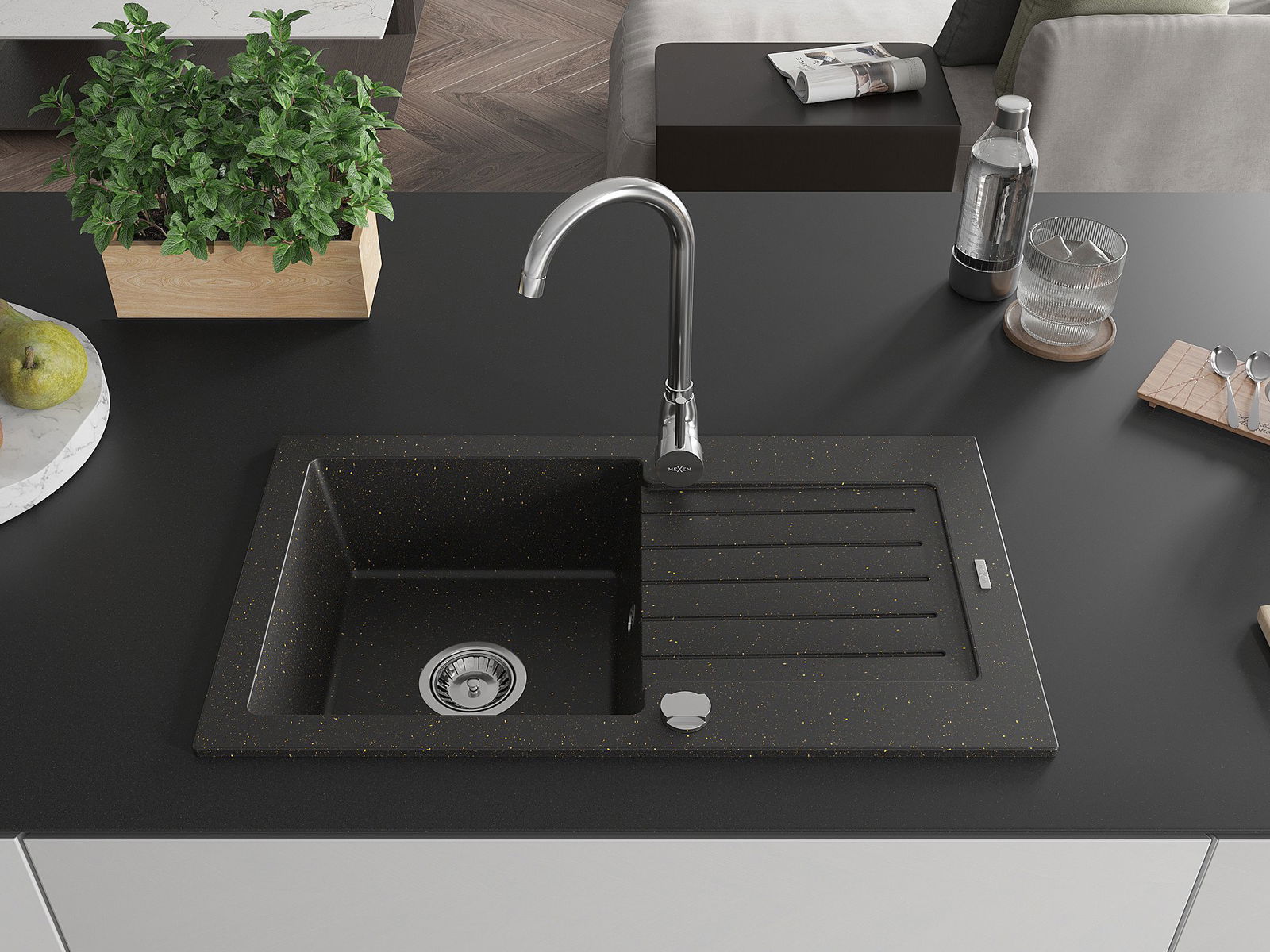 Mexen Pablo granite sink, 1-bowl with drainer 752 x 436 mm, black/gold metallic, chrome siphon - 6510751010-75