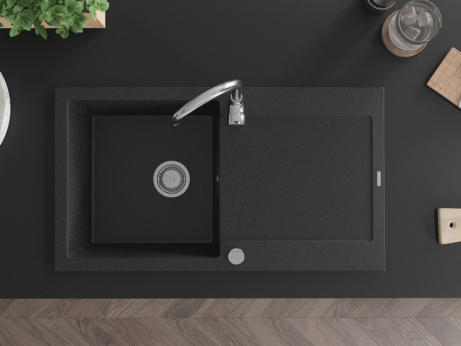 Mexen Leo 1-bowl granite sink with drainer 900 x 500 mm, black/silver metallic, chrome siphon - 6501901010-73