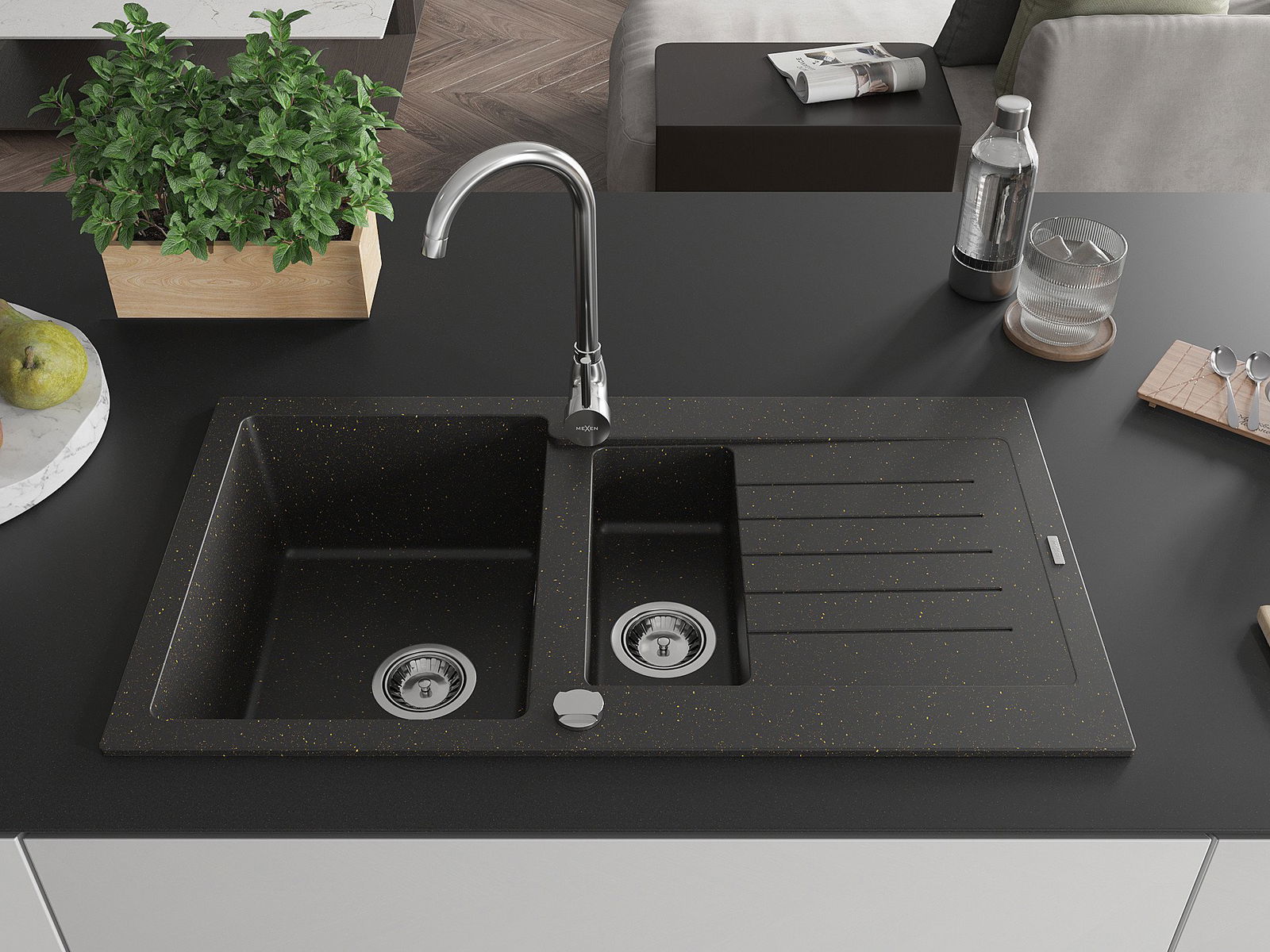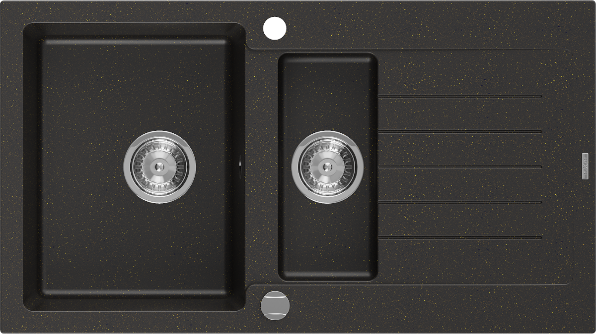 Mexen Matias 1.5-bowl granite sink with drainer 900 x 505 mm, black/gold metallic, chrome siphon - 6502901505-75