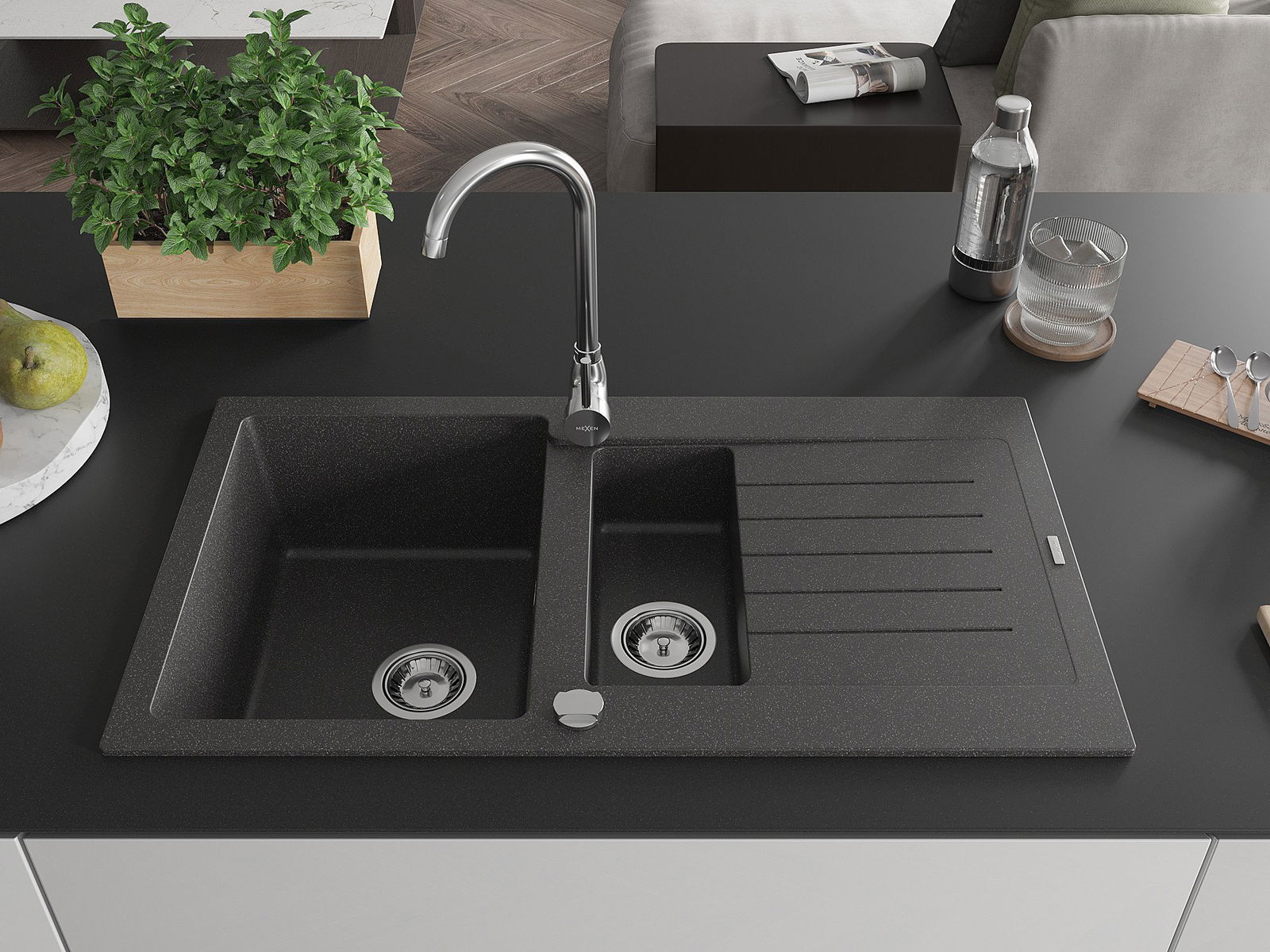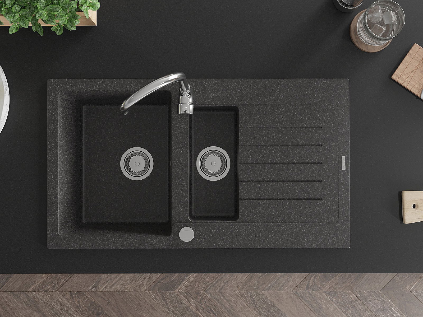 Mexen Matias granite sink 1.5-bowl with drainer 900 x 505 mm, speckled black, chrome siphon - 6502901505-76