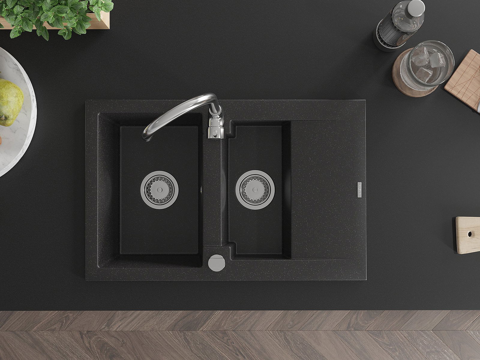 Mexen Gaspar granite sink 1.5-bowl with drainer 737 x 475 mm, black/silver metallic, chrome siphon - 6507731505-73