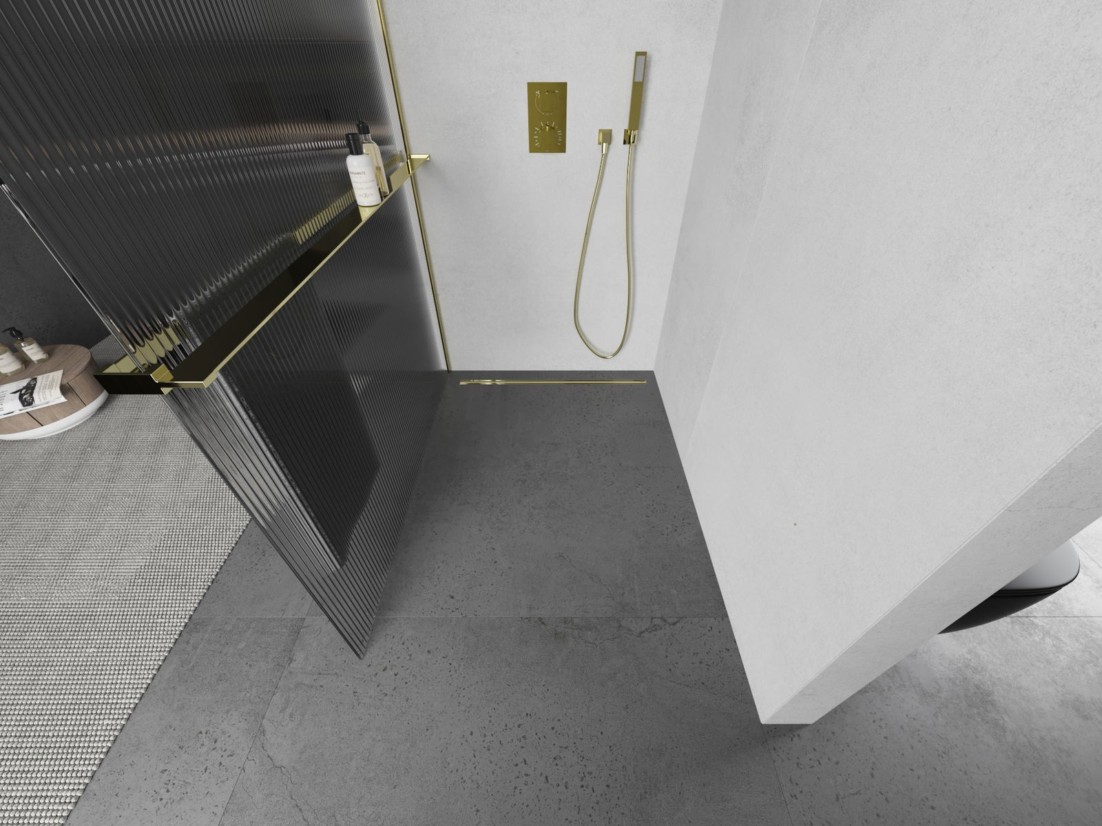 Mexen Kioto+ L Shower Screen with Shelf Walk-in 100 x 200 cm, Stripes, Gold - 800-100-123-50-09