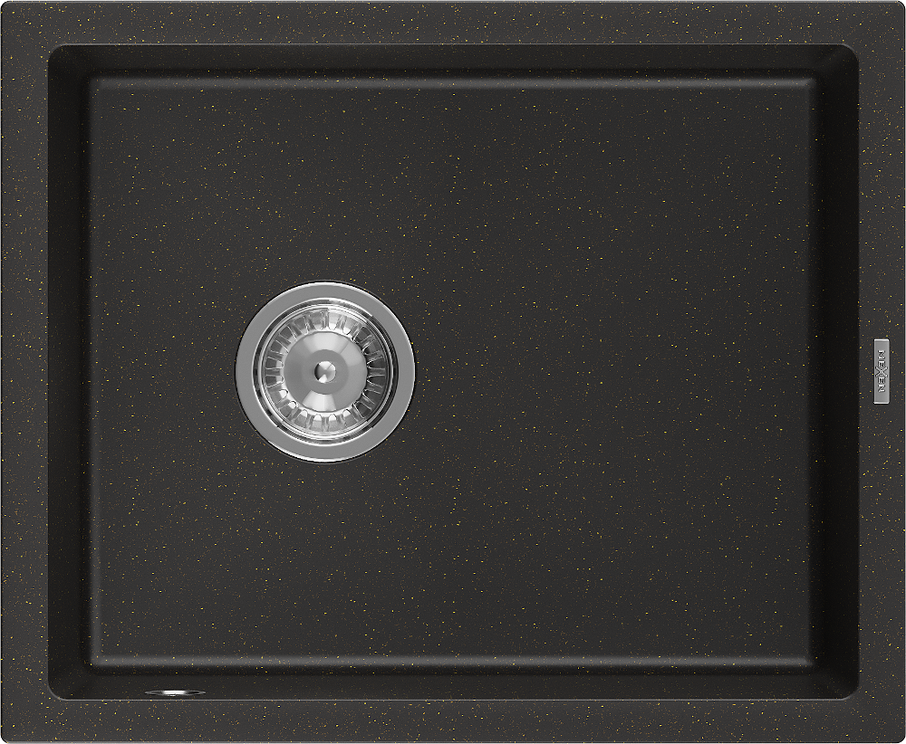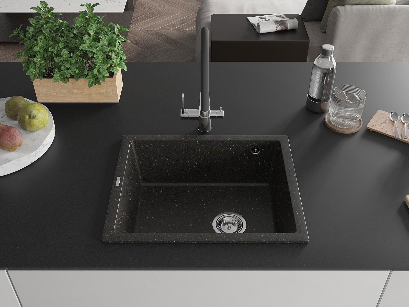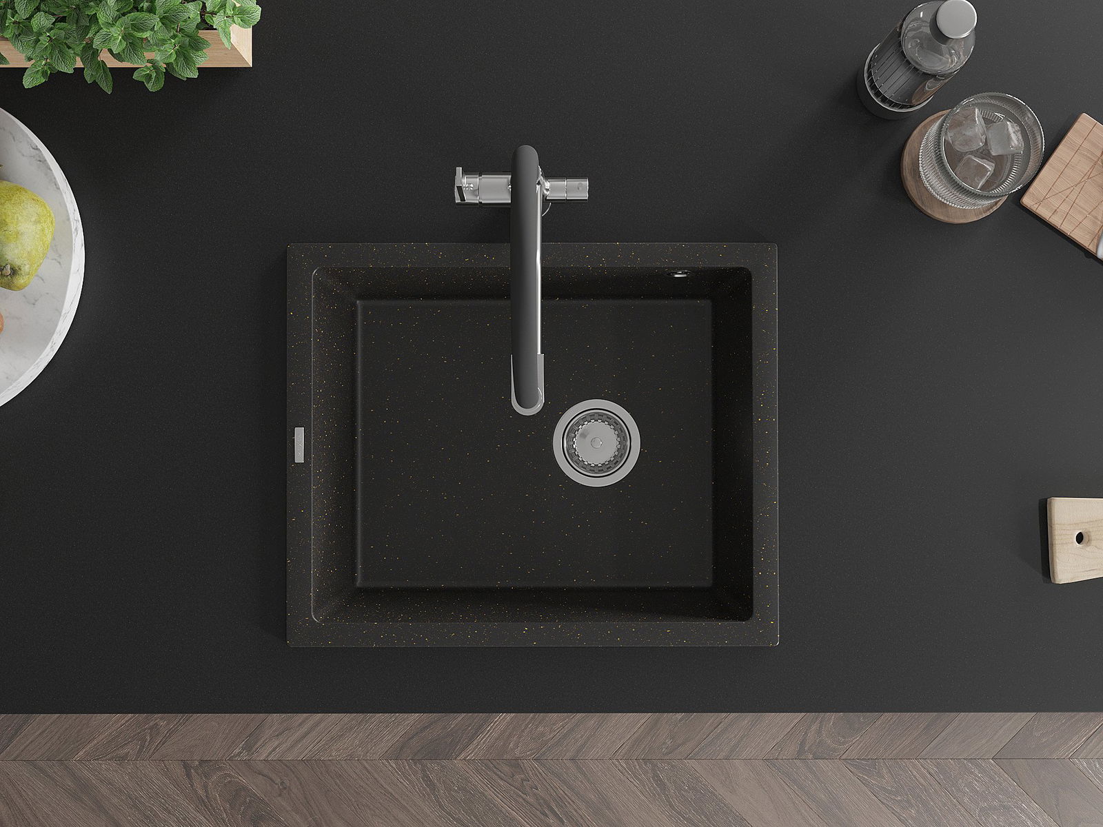 Mexen Pedro granite sink 1-bowl 560 x 460 mm, black/gold metallic, chrome siphon - 6508561000-75