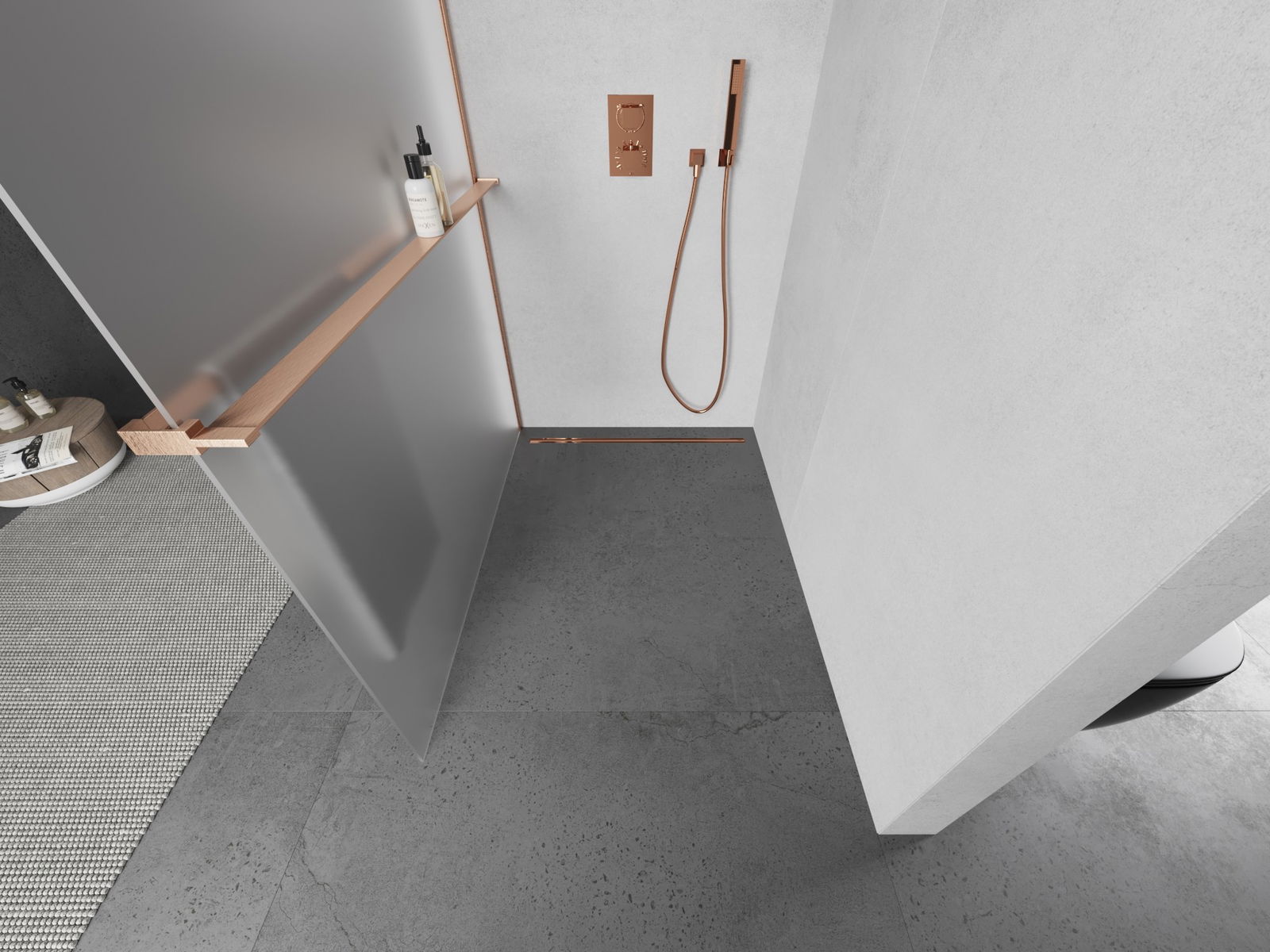 Mexen Kioto+ L shower panel with Walk-in shelf 120 x 200 cm, frost, brushed copper - 800-120-123-65-30