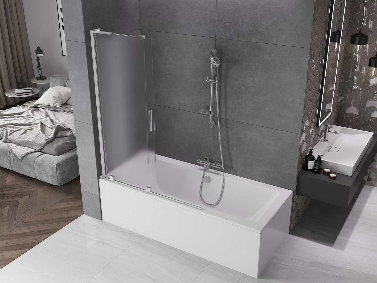 Effective protection against water spilling during bathing. The screen has seals that perfectly fit the glass surface and the edge of the bathtub. A functional solution ensuring safety and easy maintenance of cleanliness.