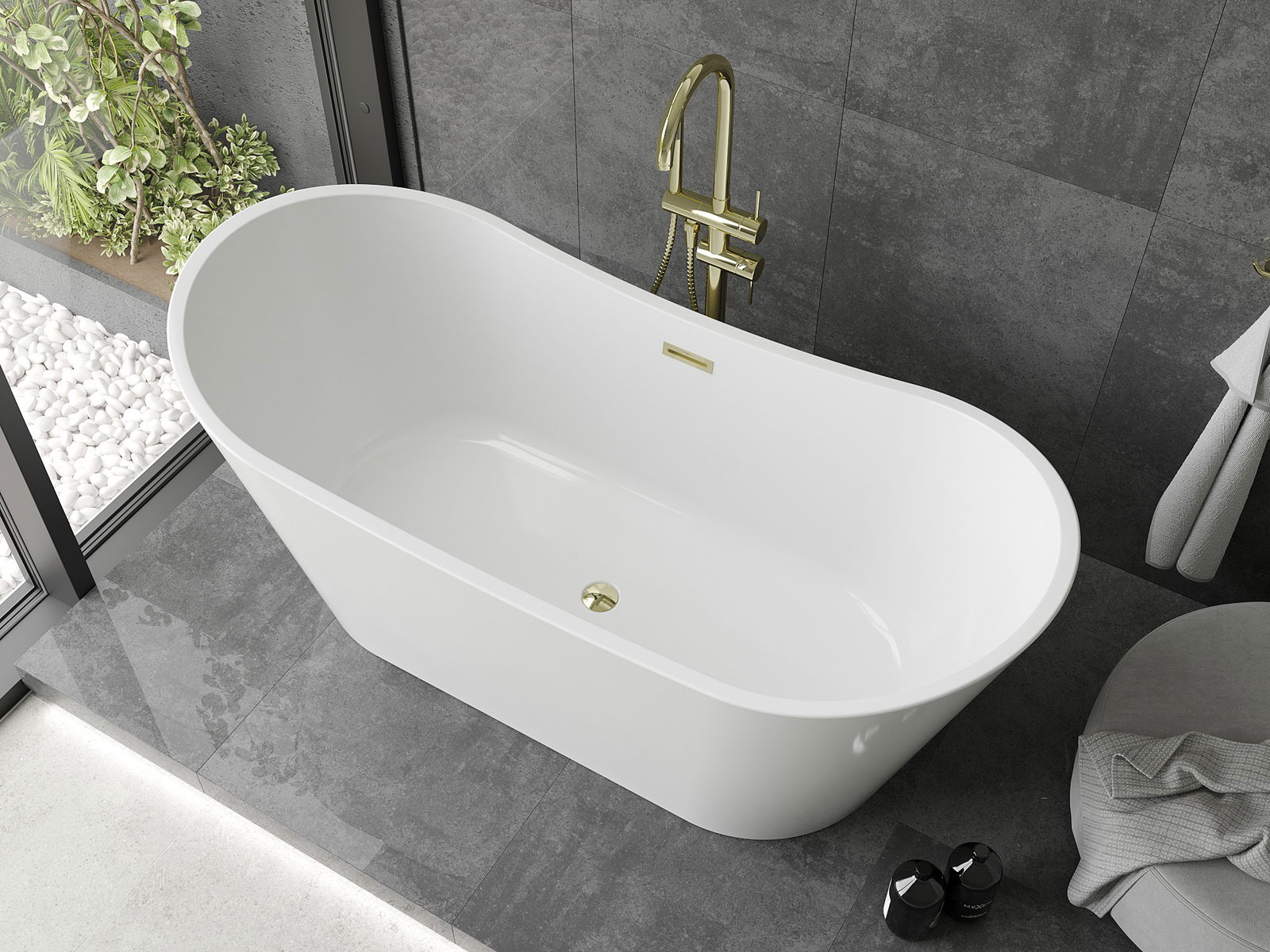 The Mexen Montana is an elegant freestanding bathtub with dimensions of 150 x 75 cm, made of high-quality sanitary acrylic in white. Its oval shape and glossy surface add a modern look to any bathroom. The bathtub is equipped with a gold finish that emphasizes its luxurious character. An additional advantage is the overflow hole and the included siphon with a click-clack plug. The bathtub is also characterized by resistance to tarnishing and UV radiation, ensuring long-term use.