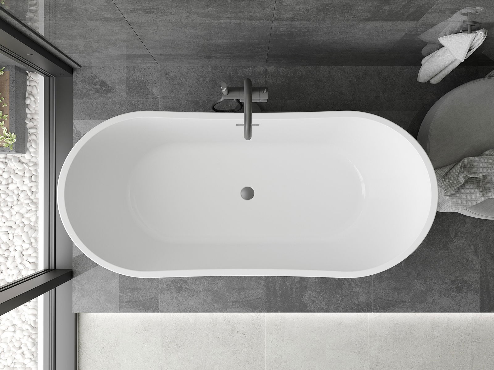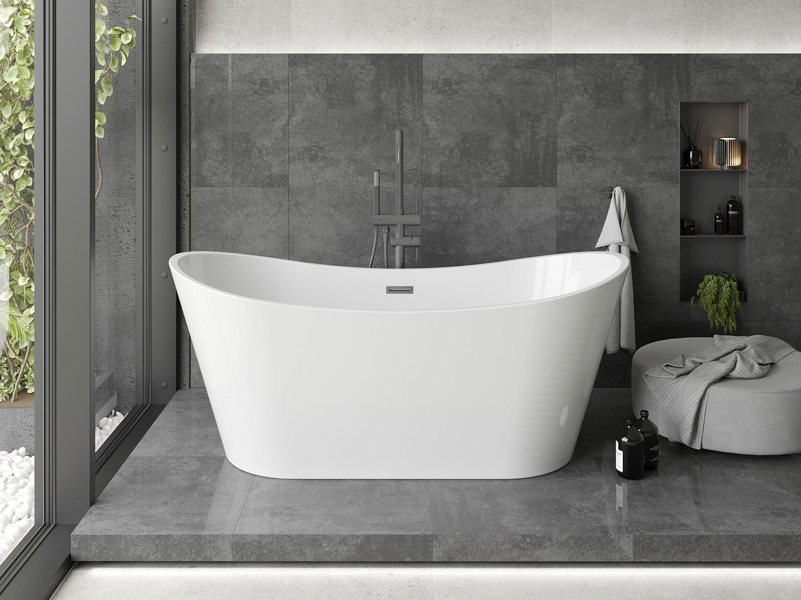 Mexen Montana is an elegant freestanding bathtub with dimensions of 170 x 80 cm, perfect for modern bathrooms. Made of sanitary acrylic in white, it offers durability and resistance to dulling and UV radiation. Its oval shape and impressive gun metal finish add exceptional style. The bathtub is equipped with an overflow opening and a siphon with click-clack plug, enhancing user comfort. Thanks to the central drainage and practical freestanding installation, it is easy to install and use daily.