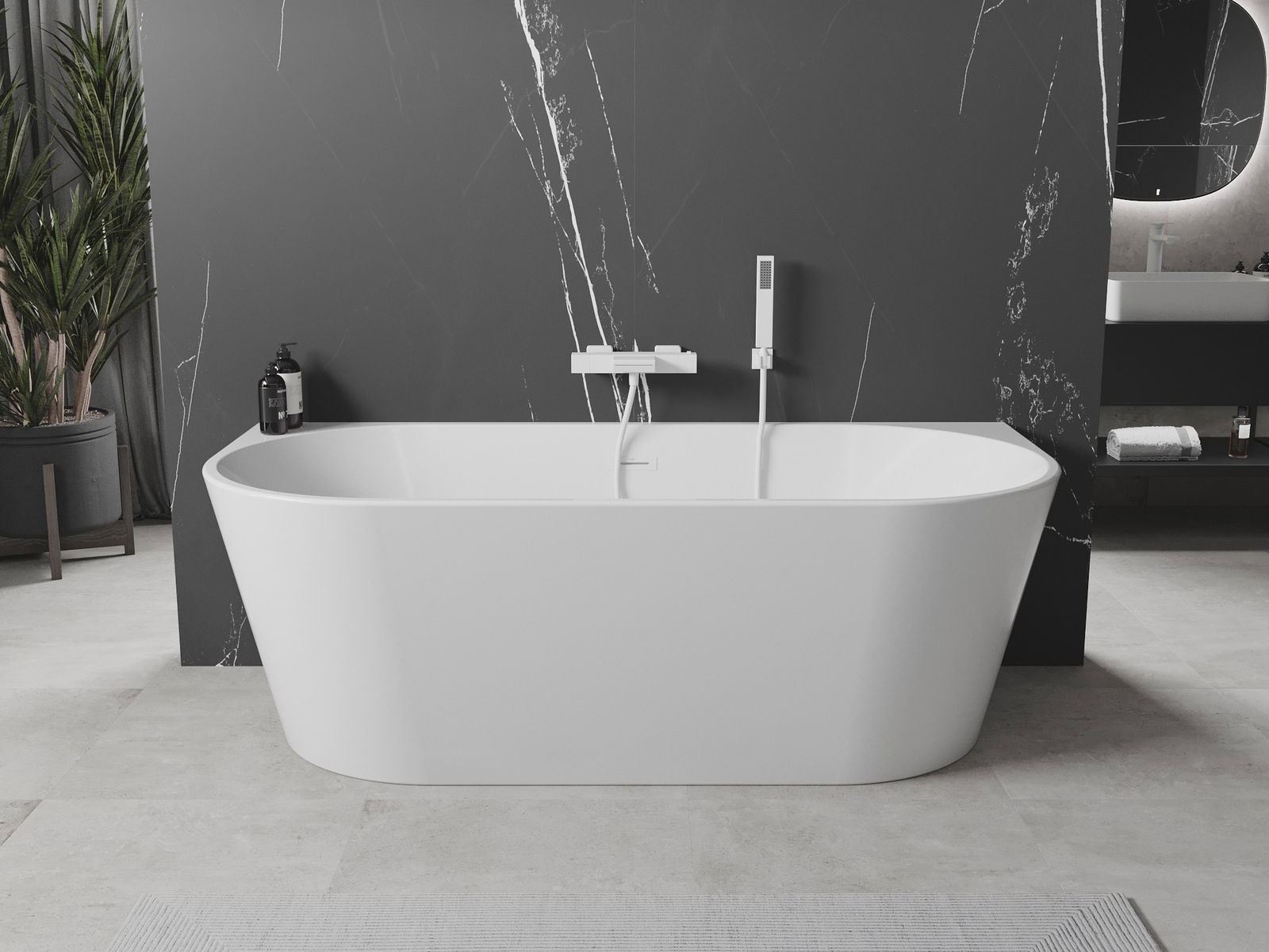 Mexen Oval is a modern freestanding wall bathtub with dimensions of 160 x 80 cm, perfect for minimalist bathrooms. Made from high-quality sanitary acrylic, it ensures long-lasting durability and resistance to matting and UV radiation. Its elegant white color and gloss add a modern charm to the interior. The bathtub features an overflow hole and a siphon with a click-clack stopper, enhancing user comfort. Its oval shape and height of 58 cm provide convenience during bathing.
