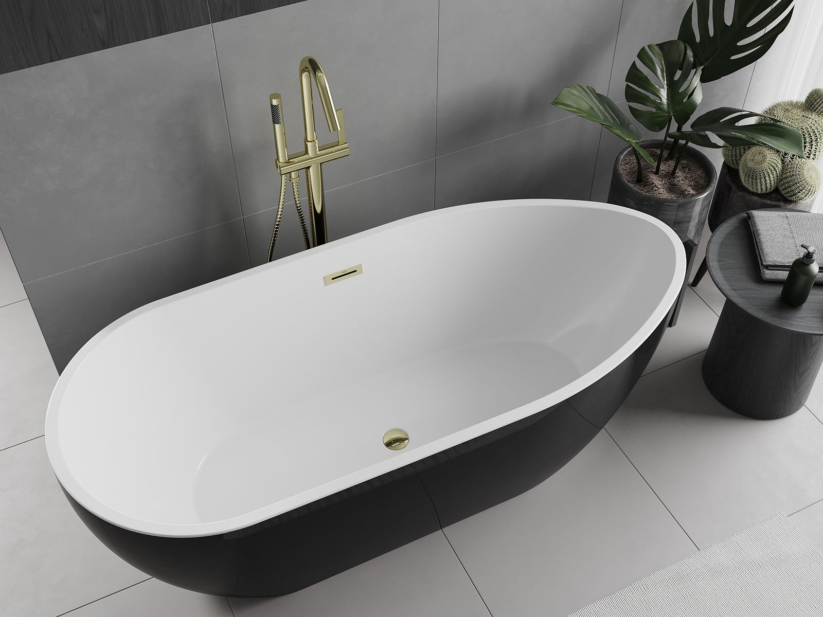 The Mexen Eos is a freestanding bath with dimensions of 170 x 75 cm, perfect for modern bathrooms. Its elegant white and black colour scheme with gold accents adds a unique style to any interior. Made from durable sanitary acrylic, the bath is resistant to tarnishing and UV radiation, ensuring long-lasting shine. The oval shape and glossy surface offer user comfort, while the overflow hole and included siphon enhance functionality. Elegance and modernity combined.